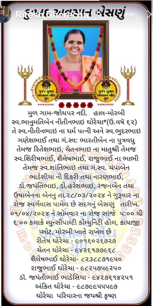 મોરબી : મૂળ જોધપર નદી હાલ મોરબી નિવાસી ભાનુમતિબેન ઘોરેચા (ઉં.વ. 62) તે સ્વ. નીતિનભાઈ ઘોરેચાના પત્ની, સ્વ. ભુદરભાઈ ગણેશભાઈ ઘોરેચા તથા ગં.સ્વ. ભારતીબેન ભુદરભાઈ ઘોરેચાના પુત્રવધુ, રિતેષભાઈ (મો.નં. 9016026727), ચેતનભાઈ (મો.નં. 94261177968)ના માતા, સ્વ. શિરીષભાઈ, શૈલેષભાઈ (મો.નં. 8238871950), રાજુભાઈ (મો.નં. 9825759250)ના ભાભી, સ્વ. શાંતિભાઈ તથા ગં.સ્વ. ચંપાબેન ભાડેશીયાના પુત્રી, નારણભાઈ, ડો. જયંતિભાઈ ભાડેશીયા (મો.નં. 9427614251), ડો. હરેશભાઈ, રંજનબેન તથા ઉષાબેનના બહેનનું તારીખ 28-3-2024 ને ગુરુવારના રોજ અવસાન થયું છે. સદગતનું બેસણું તારીખ 1-4-2024 ને સોમવારના રોજ સાંજે 5 થી 6 કલાક દરમિયાન મ્યુનિસિપાલિટી કોમ્યુનિટી હોલ, કાયાજી પ્લોટ, મોરબી ખાતે રાખવામાં આવ્યું છે.