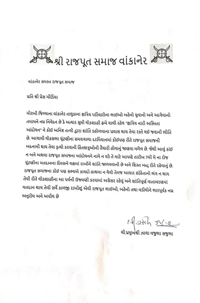 વાકાનેર : વાકાનેર રાજપૂત સમાજના પ્રમુખ ઝાલા વજુભા સજુભા એ એક પત્ર લખીને મોરબી જીલ્લાના વાકાનેર તાલુકાના ક્ષત્રિય પરિવારોના ભાઈઓ બહેનો, યુવાનો અને આગેવાનો તમામને નમ્ર નિવેદન કરતા કહ્યું છે કે, અત્યાર સુધી લોકશાહી ઢબે ચાલી રહેલ “ક્ષત્રિય નારી અસ્મીતા આંદોલન ” ને કોઈ અનિષ્ઠ તત્વો દ્વારા શાંતિ ડહૉળવાના પ્રયાસ થાય તેવા રસ્તે લઈ જવાની ભીતિ છે. આગામી લોકસભા ચૂંટણીના સમયગાળા દરમિયાનમાં કોઈપણ રીતે રાજપૂત સમાજની બદનામી થાય તેવા ક્રુત્યો કરવાની હિતશત્રુઓની તૈયારી હોવાનું જાણવા મળેલ છે. જેથી આવું કાંઈ ન બને અથવા રાજપૂત સમાજના આંદોલનને નામે ન ચડે તે માટે આપણે આગામી 7મી મેં ના રોજ ચૂંટણી મતદાનના દિવસને લક્ષમાં રાખી ને શાંતિ જાળવવાની છે અને શિસ્ત બદ્ધ રીતે રહેવાનું છે. રાજપૂત સમાજના કોઈ પણ સભ્યએ કાયદો હાથમાં ન લેવો તેમજ આચારસંહિતા ભંગ ન થાય તેવી રીતે લોકશાહીના આ પર્વની ઉજવણી કરવામાં અગ્રેસર રહેવું અને શાંતિપૂર્ણ વાતાવરણમાં મતદાન થાય તેવી સર્વે કાળજી રાખીશું એવી રાજપૂત ભાઈઓ,બહેનો તથા વડીલોને ભાર પૂર્વક નમ્ર અનુરોધ અને અપીલ કરી છે. છેલ્લા કેટલાક દિવસોથી ક્ષત્રિય સમાજ દ્વારા આંદોલન ચલાવવામાં આવી રહ્યું છે ત્યારે ક્ષત્રિય સમાજને બદનામ કરવા માટે કોઈ હિતશત્રુ તેનો ગેરલાભ ન લઇ જાય તે માટે સમાજને સતર્ક રહેવા માટે અપીલ કરવામાં આવી છે.