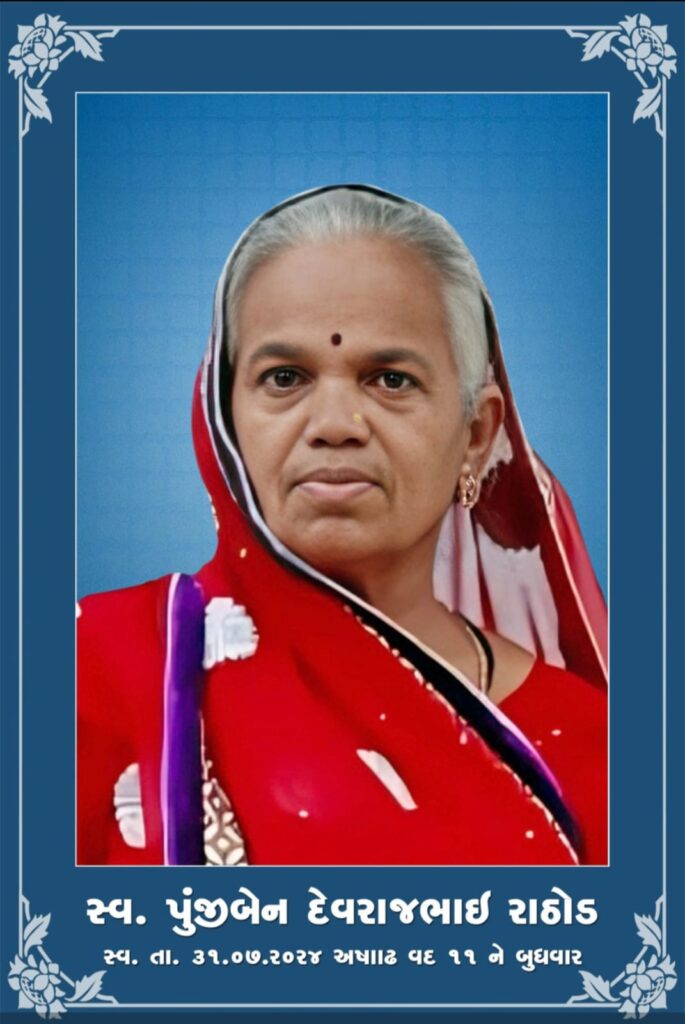મોરબી :મૂળ મેઘપર ગામના વતની અને હાલ મોરબીના સામાંકાંઠા સોઓરડીમાં અંદર આવેલ ચામુંડા નગરમાં રહેતા પુંજીબેન દેવરાજભાઈ રાઠોડ (ઉ.વ.62) તે દેવરાજભાઈ મઘાભાઈ રાઠોડના ધર્મપત્ની અને દાનભાઈના ભાભી તેમજ લક્ષ્મણભાઈ, દેવસીભાઈના નાનાભાઈના પત્ની અને હરેશભાઇ, ભરતભાઇ, રમીલાબેન, લીલાબેનના માતૃશ્રી તેમજ વિજયભાઈ, કુલદીપભાઈના ભાભુનું તા.31 જુલાઈના રોજ અવસાન થયું છે.