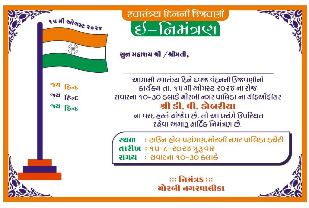 મોરબી : સ્વતંત્ર્ય દિવસની ઉજવણીના ભાગરૂપે 15મી ઓગસ્ટ 2024ના રોજ સવારે 10:30 કલાકે મોરબી નગરપાલિકા કચેરી ટાઉન હોલ પટાંગણ ખાતે કાર્યક્રમ યોજાશે. આ કાર્યક્રમનું આયોજન મોરબી નગર પાલિકાના ચીફ ઓફિસર ડી.વી. ડોબરીયાના વરદ હસ્તે યોજવામાં આવશે. ત્યારે આ પ્રસંગે ઉપસ્થિત રહેવા આમંત્રણ પાઠવવામાં આવ્યું છે.