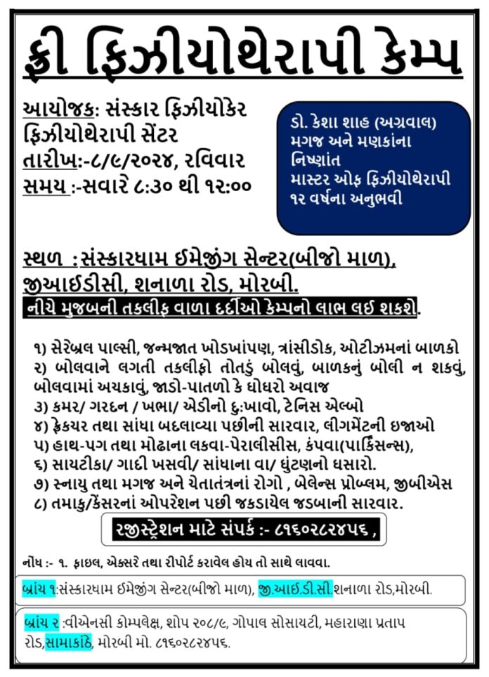 વિશ્વ ફિઝીયોથેરાપી દિવસ ૮ સપ્ટેમ્બર નિમિતે મોરબીમાં રાહત દરે કાર્યરત સંસ્કાર ફિઝીયોકેર સેંટર, શ્રી સંસ્કારધામ ઇમેજિંગ સેન્ટરની મલ્ટી સ્પેશિયાલિટી ફિઝિયોથેરાપી ટીમ દ્વારા નિ:શુલ્ક ફિઝિયોથેરાપી કેમ્પ
