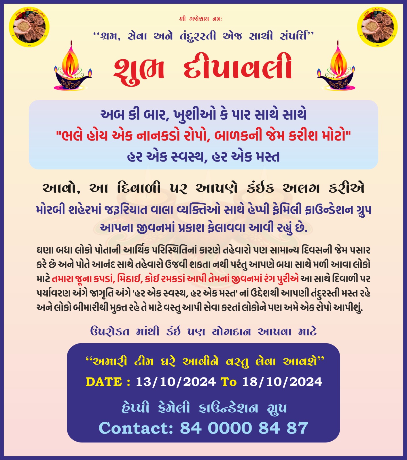 આર્થિક પરિસ્થિતિના કારણે ઘણા લોકો તહેવારો પણ સામાન્ય દિવસની જેમ પસાર કરતાં હોય છે અને તહેવાર ઉજવી શકતા નથી. ત્યારે હેપ્પી ફેમિલી ફાઉન્ડેશન ગ્રુપ દ્વારા લોકોને અપીલ કરવામાં આવી છે કે આપની પાસે રહેલા જુના કપડાં, મીઠાઈ, રમકડાં ફાઉન્ડેશનને આપી શકે છે. આ વસ્તુઓ તહેવાર પર જરૂરિયાતમંદ લોકોને આપવામાં આવશે. આ સાથે જ દિવાળી પર્વ પર પર્યાવરણ જાગૃતિ અંગે હર એક સ્વસ્થ, હર એક મસ્તના ઉદ્દેશથી લોકો બીમારીમાંથી મુક્ત રહે તે માટે વસ્તુ આપી સેવા કરતાં લોકોને ફાઉન્ડેશન દ્વારા એક રોપો આપવામાં આવશે. તેથી જો કોઈને જરૂરિયાતમંદ લોકો માટે વસ્તુઓ આપવી હોય તો તારીખ 13 ઓક્ટોબર થી 18 ઓક્ટોબર સુધી મો.નં. 8400008487 પર સંપર્ક કરવા જણાવાયું છે. હેપ્પી ફેમિલી ફાઉન્ડેશન ગ્રુપની ટીમ ઘરે આવીને વસ્તુઓ લઈ જશે.