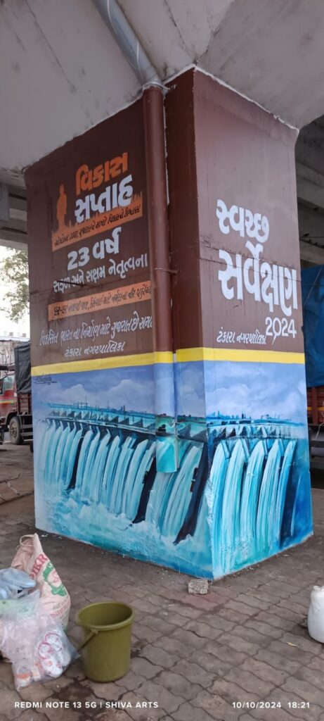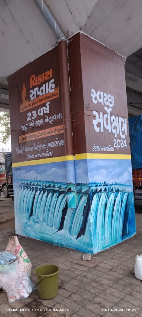 વિકાસ સપ્તાહની ઉજવણીના ભાગરૂપે મોરબી જિલ્લામાં ઠેર-ઠેર અનેકવિધ કાર્યક્રમ યોજાઇ રહ્યા છે. છેલ્લા ૨૩ વર્ષમાં ગુજરાત રાજ્યએ વિકાસના માર્ગે જે ઊંચાઈઓ હાંસલ કરી છે તે વિકાસ યાત્રાને પ્રદર્શિત કરતા ભીંત ચિત્રો પણ અનેક સ્થળે બનાવવામાં આવી રહ્યા છે. ત્યારે ટંકારા નગરપાલિકા અને વાંકાનેર નગરપાલિકા દ્વારા બ્રિજ અને જાહેર સ્થળો સહિતની જગ્યાઓ પર રીન્યુએબલ એનર્જી કેપિટલ, સરદાર સરોવર ડેમ અને નર્મદા નહેર નેટવર્ક, જલ સે જલ સહિત ગુજરાતની વિકાસ ગાથાને અંકિત કરી ભીંત ચિત્રો બનાવવામાં આવ્યા છે.