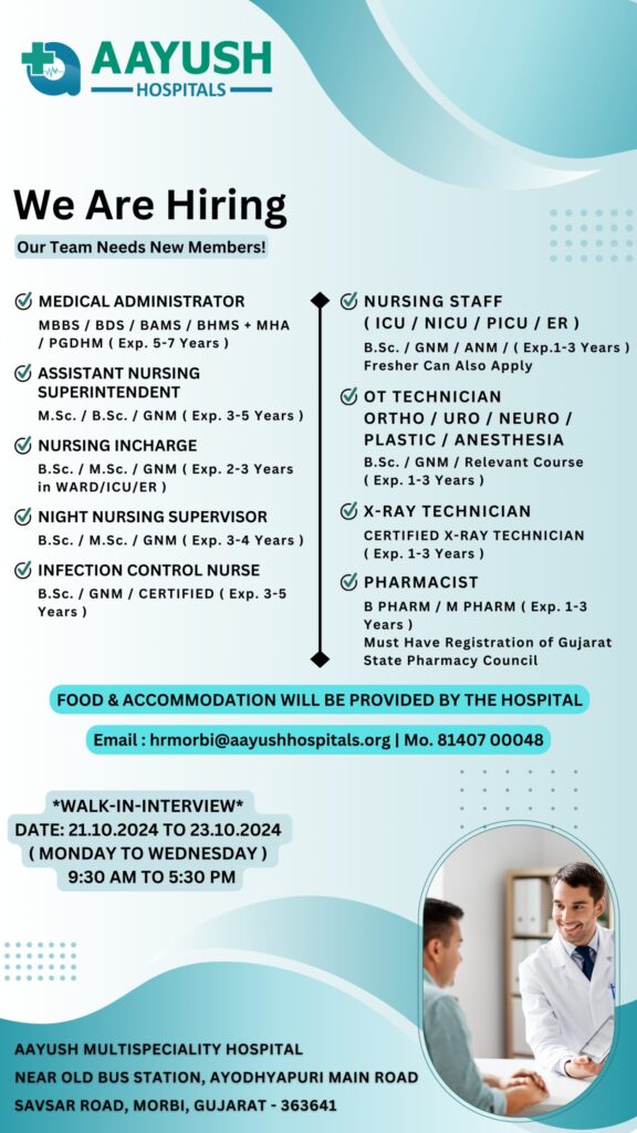 શુ તમારે નોકરીની જરૂર છે તો આયુષ હોસ્પિટલનો સંપર્ક કરો