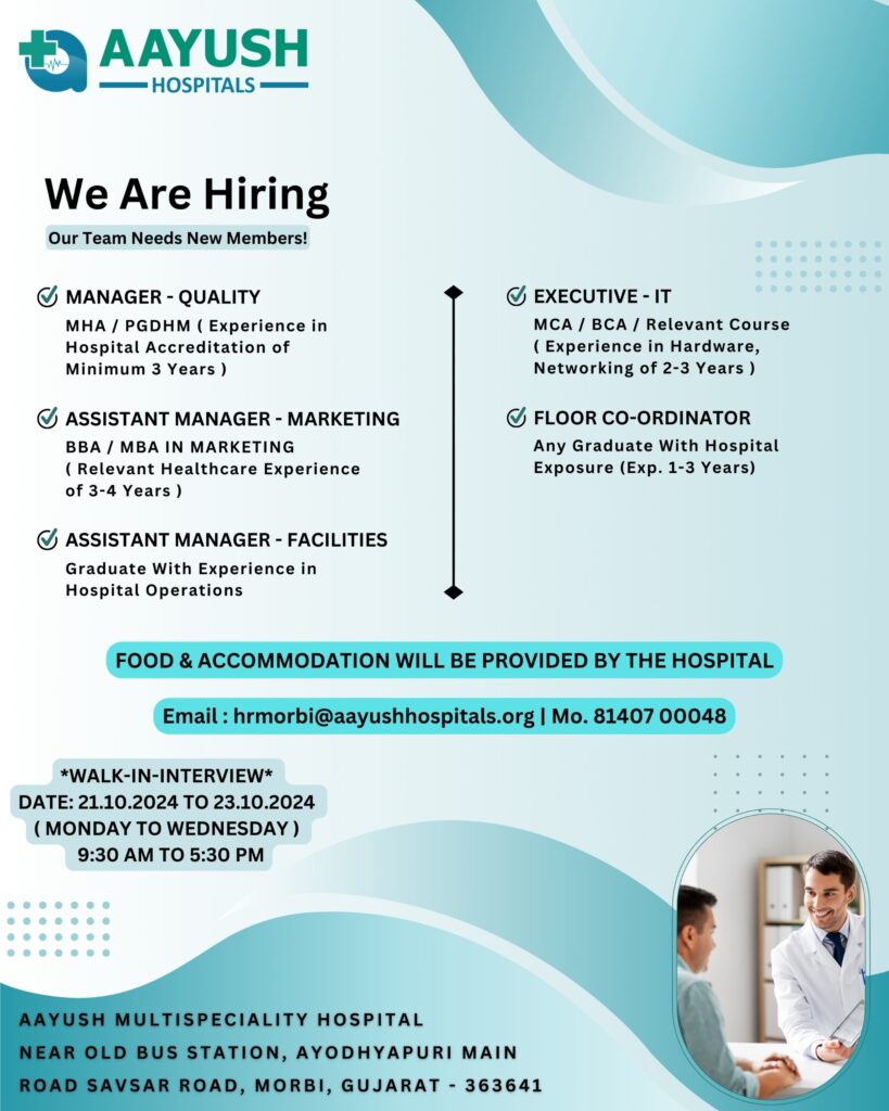 શું તમારે નોકરીની જરૂર છે તો નોકરી માટે ક્યાંય ભટકવાની જરૂર નથી. આયુષ હોસ્પિટલમાં શ્રેષ્ઠ નોકરીની તક આવી છે. જેમાં જાણીતી અને નંબર વન આયુષ હોસ્પિટલમાં વિવિધ જગ્યાઓ માટે નોકરી વેકેન્સી જાહેર કરવામાં આવી છે. તા.21-10-2024 થી 23 -10-2024 સુધી માં સવારે 9.30 થી 5.30 દરમ્યાન રૂબરૂ મળી શકશે આયુષ હોસ્પિટલમાં સારો એવો આકર્ષક પગાર સાથે રહેવા અને જમવાની પણ સુવિધાઓ હોસ્પિટલ આપશે