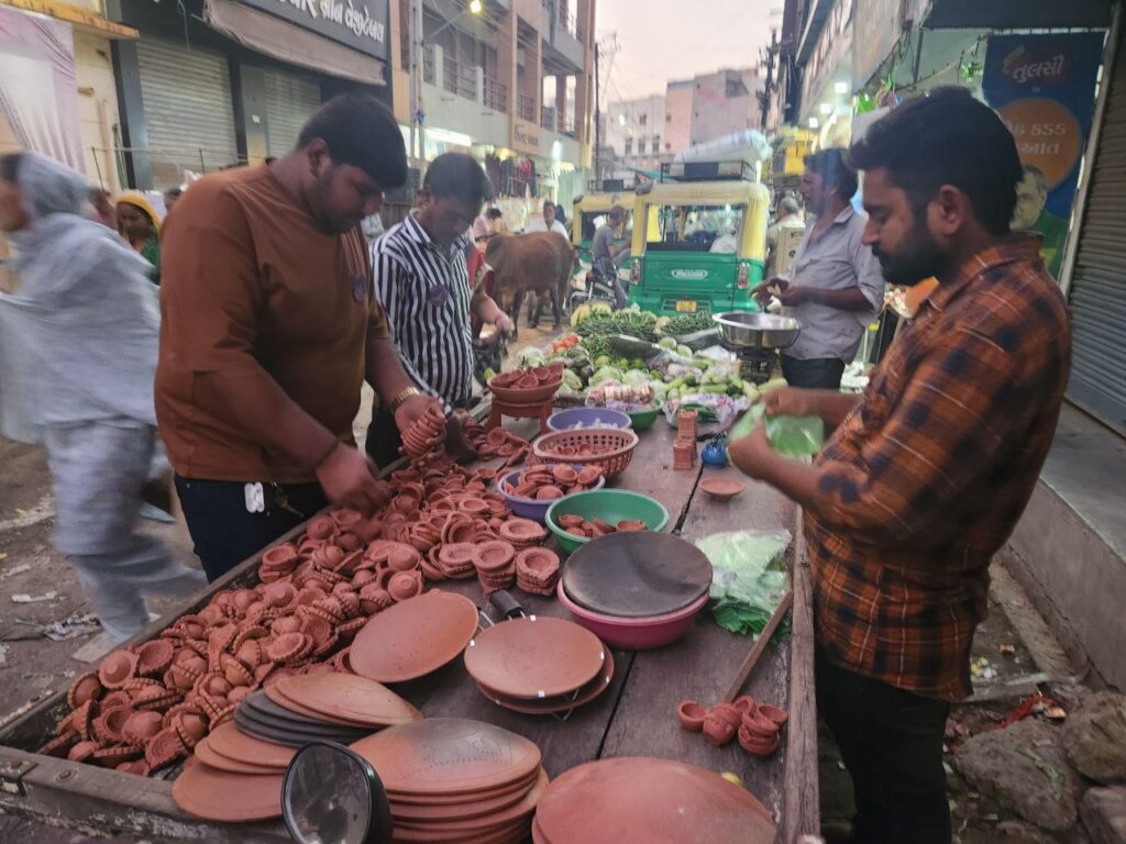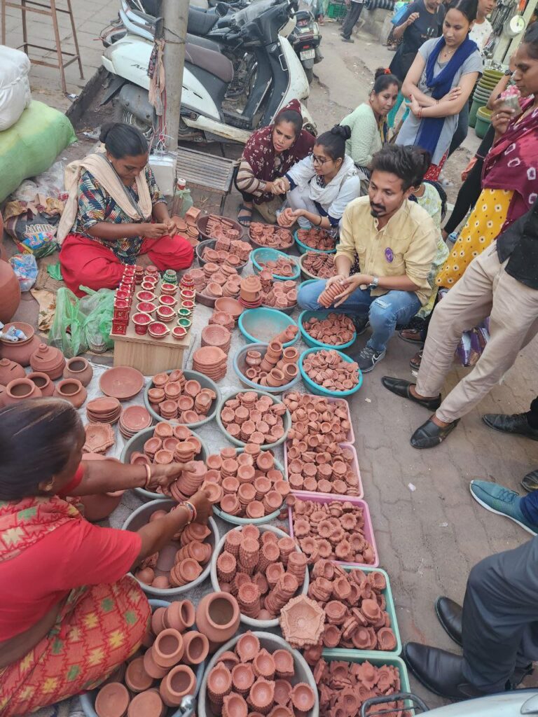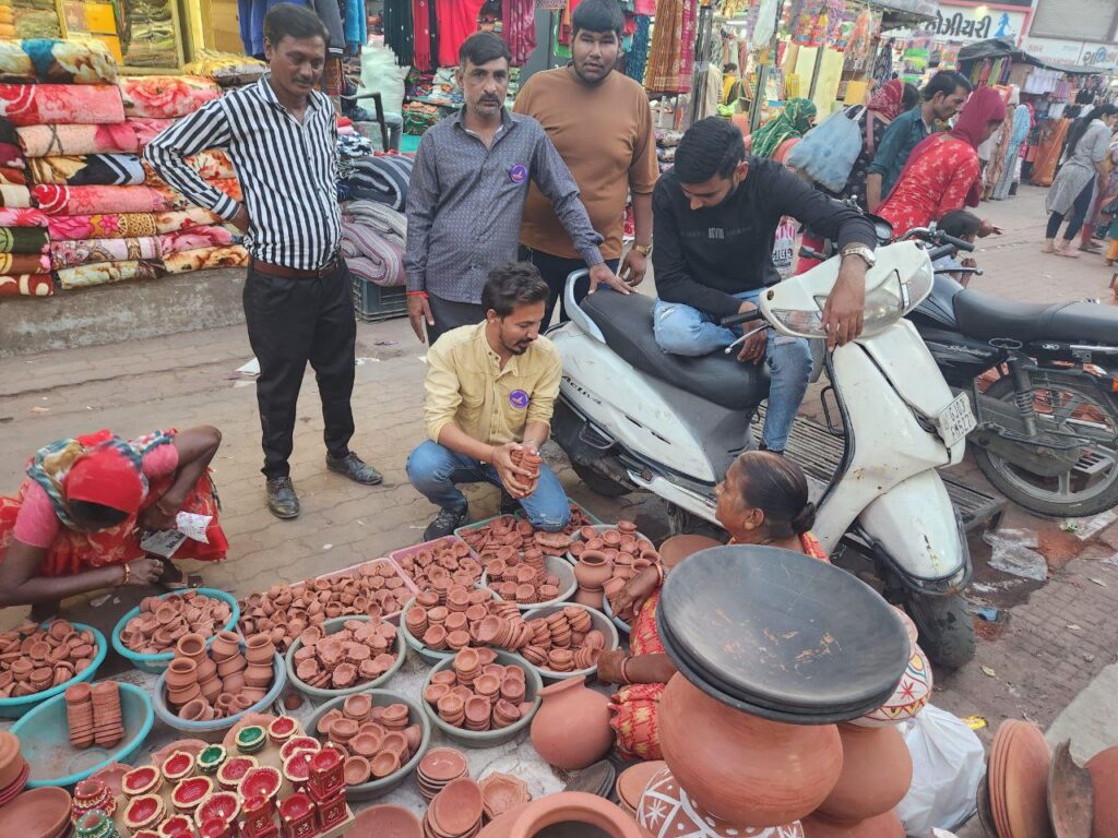 મોરબી : શહેરના નહેરુ ગેઇટ સહિતના બજાર વિસ્તારમાં ઘણા સામાન્ય માણસો પાથરાણા પથારીને દિવડા-કોડિયા, ફુલહાર તોરણ, ઘર સુશોભનની સહિતની અનેક નાની-મોટી ચીજવસ્તુઓનો વેપાર કરે છે.તેમજ અમુક સામાન્ય વર્ગના લોકો રેકડી કે કેબિનમાં આવી વસ્તુઓ વેચે છે. ત્યારે આવા સાવ નાના વર્ગના માણસોનું ખમીર જળવાઈ રહે તેમજ તેમને સ્વનિર્ભર બનવા માટે પ્રોત્સાહન પૂરું પાડવા માટે યંગ ઇન્ડિયા ગ્રુપના તમામ સભ્યોએ પોતાના પરિવાર માટે કોઈ શોપિંગ મોલ કે મોટા શો રૂમને બદલે આવા પાથરાણાવાળા લોકો પાસેથી દિવાળીનું શોપિંગ કર્યું હતું.