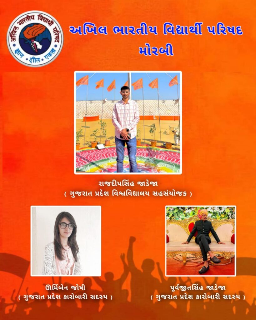 મોરબી : અખિલ ભારતીય વિદ્યાર્થીનું પ૬મું પ્રદેશ અધિવેશન તા. ૭-૮-૯ જાન્યુઆરીએ કર્ણાવતી ખાતે યોજાયું હતું. આ વેળાએ ગુજરાત પ્રદેશ કારોબારી 2025 – 26 ની ઘોષણા કરવામાં આવી હતી. જેમાં ABVP મોરબી શાખાના કાર્યકર્તા એવાં રાજદીપસિંહ જાડેજાને ગુજરાત પ્રદેશ વિશ્વવિદ્યાલય સહ સંયોજક, પૂર્વજીતસિંહ જાડેજાને ગુજરાત પ્રદેશ કારોબારી સદસ્ય, ઊર્મિબેન જોષીને ગુજરાત પ્રદેશ કારોબારી સદસ્ય તરીકેની જવાબદારી સોંપવામાં આવી છે. સમગ્ર ગુજરાતની છાત્ર શક્તિ દ્વારા તેમને અભિનંદન પાઠવવામાં આવ્યાં છે. તેમ યાદીમાં જણાવાયું છે.