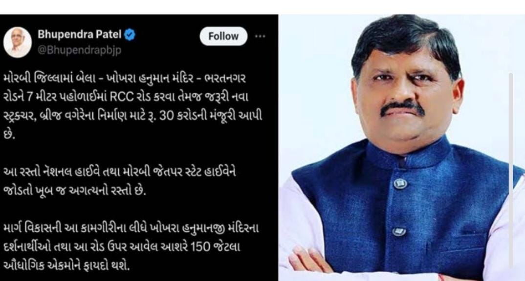 મોરબીત તાલુકાના ઔધોગિક વિસ્તાર, બેલા ખોખરાધામ ભરતનગર રોડ પર દીવસ દરમિયાન મોટા હેવી ટ્રક પસાર થતા હોય તેમજ ધાર્મિક સ્થળ ખોખાર હનુમાન ધામ પણ અહીં આવેલ હોય જેમાંમોટી સંખ્યામાં લોકો દર્શન માટે આવતા હોય છે જોકે આ રોડ સીગલ પટી તેમજ ડામર લેર હોવાથી વાંરવાર તૂટી જતો હોય આં બાબતે સ્થાનિકો દ્વારા મોરબીના ધારાસભ્ય કાન્તીભાઈ અમૃતિયાને રજૂઆત કરતા કાંતિભાઈએ આ રોડ આરસીસી બને તેવા પ્રયાસ હાથ ધર્યા હતા અને સીએમ સુધી આ અંગે રજૂઆત કરતા મુખ્ય મંત્રી ભુપેન્દ્ર પટેલે મોરબીના મહત્વના રોડ એવા બેલા ખોખરાધામ અને ભરતનગર ને જોડતા રોડ માટે 3 30 કરોડ મંજુર કર્યા છે આગામી સમયમાં તમામ વહીવટી પ્રક્રિયા પૂર્ણ થતા વહેલી તકે આ રોડ નું કામ શરુ થાય તેવી ધારાસભ્યે આશા વ્યક્ત કરી છે