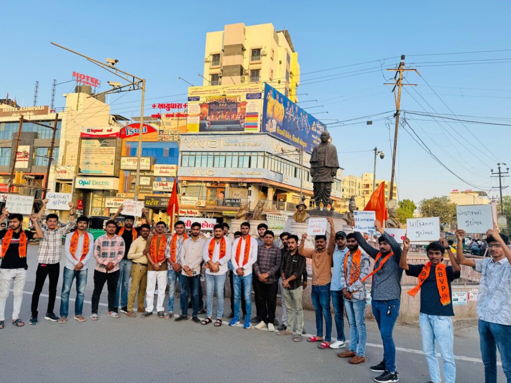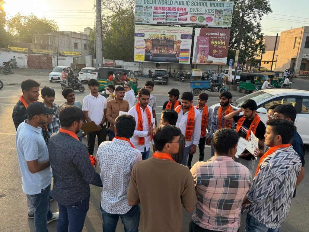 મોરબી : અખિલ ભારતીય વિદ્યાર્થી પરિષદ મોરબી દ્વારા જમ્મુ કાશ્મીરના પહલગામમાં થયેલ આતંકી હુમલાને લઈને ઉગ્ર સૂત્રોચાર સાથે જાહેર રસ્તા પર બહોળી સંખ્યામાં વિદ્યાર્થીઓને સાથે રાખી વિરોધ પ્રદર્શન કરવામાં આવ્યું હતું.