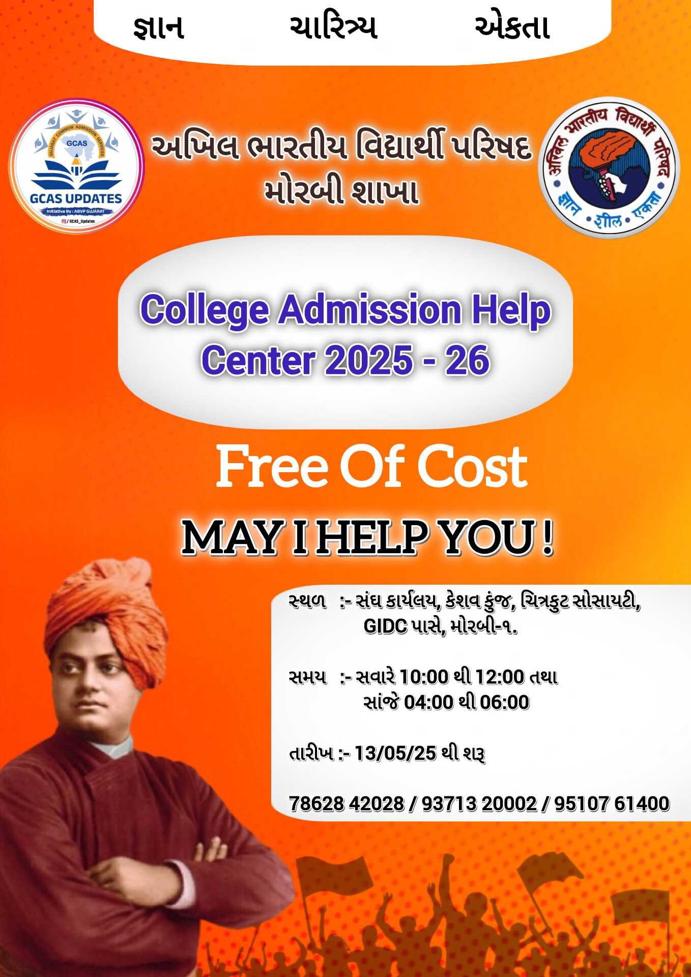 મોરબી: અખિલ ભારતીય વિદ્યાર્થી પરિષદ મોરબી દ્વારા આવતીકાલે તારીખ 13 મેથી વિદ્યાર્થી સહાયતા કેન્દ્રનું આયોજન કરવામાં આવશે. જેમાં વિદ્યાર્થીઓએ કોલેજની અંદર એડમિશન મેળવવા માટે GCAC પોર્ટલ પર ફોર્મ ભરવું આવશ્યક છે. જેના માટે અખિલ ભારતીય વિદ્યાર્થી પરિષદ મોરબી દ્વારા “વિદ્યાર્થી સહાયતા કેન્દ્ર”પર gacs પોર્ટલ પર કોઈ પણ જાતના વધારાના ચાર્જ વગર ફ્રી ઓફ કોસ્ટ રજીસ્ટ્રેશન કરી આપવામાં આવશે. Help desk ની માહિતી માટે સવારે 10 થી 12 અને સાંજે 4 થી 6 વાગ્યા સુધીમાં GIDC પાસે, ચિત્રકૂટ સોસાયટી, કેશવ કુંજ, સંઘ કાર્યાલયથી મેળવી શકશો. વધુ માહિતી માટે મો.7862842028, 9371320002, 9510761400 પર સંપર્ક કરી શકાશે.