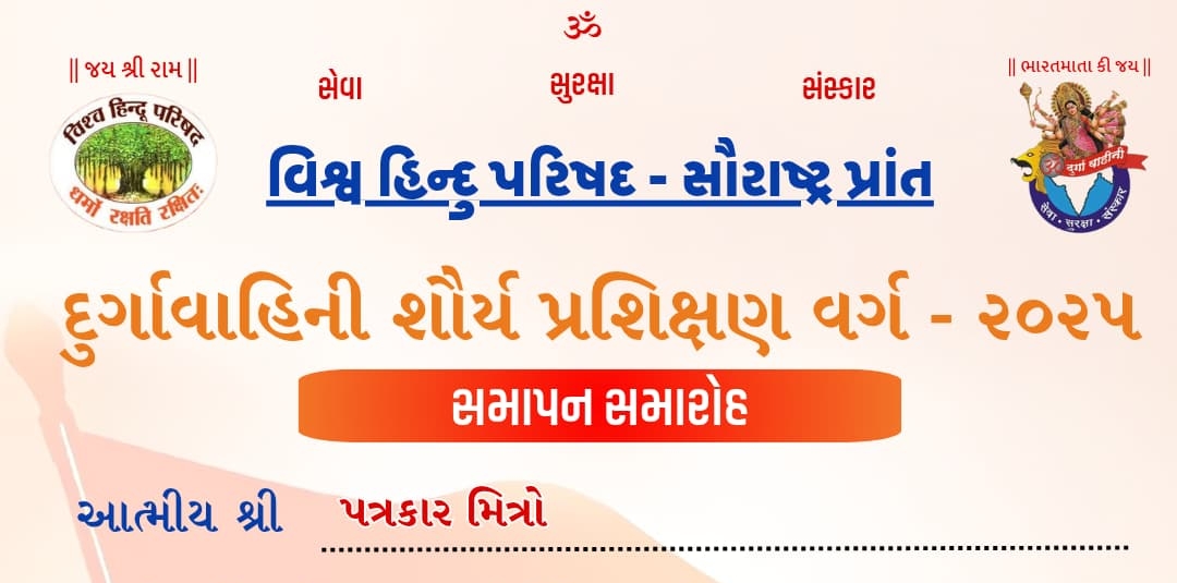 ત્યારે આવતીકાલે તારીખ 31 માર્ચને શનિવારના રોજ સાંજે 5:30 કલાકે ઓમ શાંતિ વિદ્યા સંકુલ, ઉમા રિસોર્ટ સામે, કંડલા બાયપાસ રોડ મોરબી ખાતે વિશ્વ હિન્દુ પરિષદ-સૌરાષ્ટ્ર પ્રાંત દુર્ગા વાહિની શોર્ય પ્રશિક્ષણ વર્ગ-2025ના સમાપન સમારોહનું આયોજન કરવામાં આવ્યું છે. આ સમાપન સમારોહમાં મુખ્ય વક્તા તરીકે દેવજીભાઈ રાવત (અખિલ ભારતીય સામાજિક સમરસતા સંયોજક), અતિથિ વિશેષ તરીકે ભૂમિકાબેન ભૂત (પોલીસ કોન્સ્ટેબલ અને પોલીસ સ્પોર્ટસ ક્વોટા), સ્થાન અધ્યક્ષ તરીકે ઠાકરશીભાઈ ડી પટેલ (ટ્રસ્ટીશ્રી ઓમ શાંતિ વિધાલય ગુજરાતી) ઉપસ્થિત રહેશે.