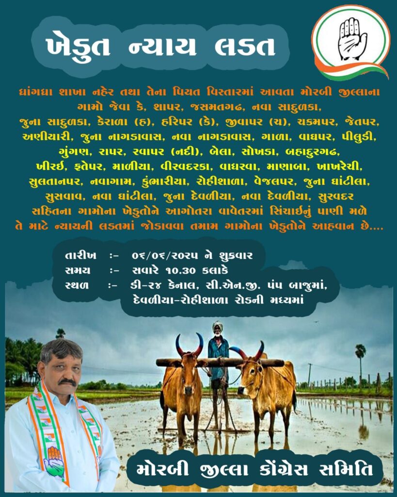 આ અંગે વિગતો આપતા જિલ્લા કોંગ્રેસ પ્રમુખ કિશોરભાઈ ચીખલીયાએ જણાવ્યું કે ધ્રાંગધ્રા શાખા નહેર તથા તેના પિયત વિસ્તારમાં આવતા મોરબી જીલ્લાના ગામો જેવા કે, શાપર, જસમતગઢ, નવા સાદુળકા, જુના સાદુળકા, કેરાળા, હરિપર, જીવાપર, ચકમપર, જેતપર, અણીયારી, જુના નાગડાવાસ, નવા નાગડાવાસ, ગાળા, વાઘપર, પીલુડી, મુંગણ, રાપર, રવાપર (નદી), બેલા, સોખડા, બહાદુરગઢ, ખીરઈ, ફતેપર, માળીયા, વીરવદરકા, વાઘરવા, માણાબા, ખાખરેચી, સુલતાનપર, નવાગામ, કુંભારીયા, રોહીશાળા, વેજલપર, જુના ઘાંટીલા, સુસવાવ, નવા ઘાંટીલા, જુના દેવળીયા, નવા દેવળીયા, સુરવદર સહિતના ગામોના ખેડુતોને આગોતરા વાવેતરમાં સિંચાઈનું પાણી મળે તે માટે કોંગ્રેસ દ્વારા ન્યાયની લડત આપવામાં આવશે.