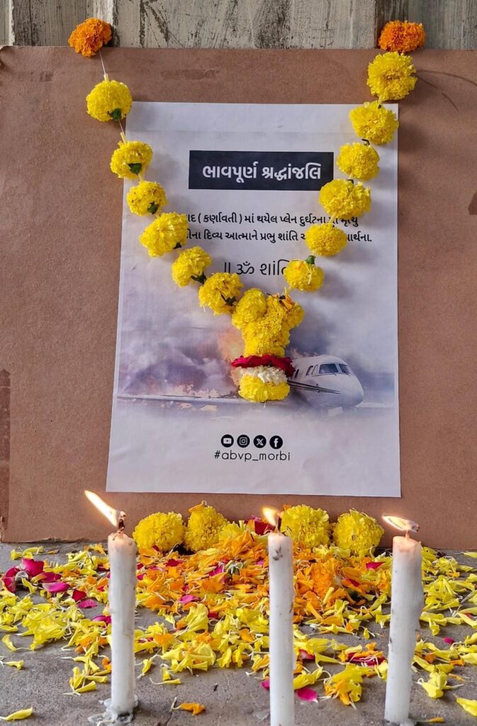 મોરબી : અખિલ ભારતીય વિદ્યાર્થી પરિષદ મોરબી દ્વારા અમદાવાદમાં થયેલ પ્લેન ક્રેશ દુર્ઘટનામાં મૃત્યુ પામેલા મૃતકોને શ્રદ્ધાંજલિ અર્પણ કરવામાં આવી હતી.