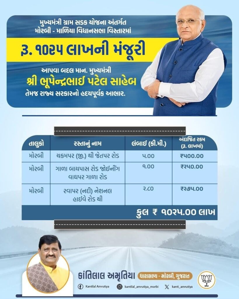ધારાસભ્ય કાંતિલાલની રજુઆત ફળી : મુખ્યમંત્રી ગ્રામ સડક યોજના હેઠળ મોરબી તાલુકાના ત્રણ રસ્તાના કામ મંજૂર