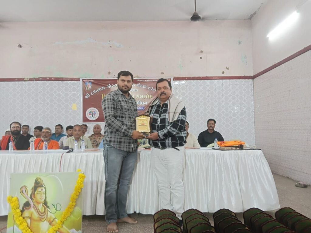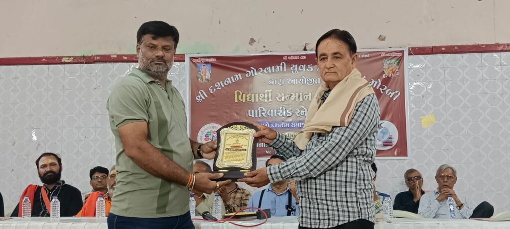 મોરબી : મોરબી દશનામ ગોસ્વામી યુવક મંડળ ટ્રસ્ટ દ્વારા ચતુર્થ વિધાર્થી સન્માન સમારોહ ને પારીવારીક સ્નેહમિલન નું આયોજન તાજેતર માં શ્રી દશાશ્રી વણિક જ્ઞાતિની વાડી ખાતે કરવામાં આવ્યું હતું જેમાં કુલ કે જી થી કોલેજ સુધી ના ૨૬૦ વિધાર્થીઓ ને યોગ્યતા મુજબ શિક્ષણકીટ ને શિલ્ડ આપી સન્માનિત કરાયા હતા સાથે સમાજ ના કાર્ય માં કાયમી સહયોગ આપતા દાતાઓ તેમજ ગોસ્વામી સમાજ ના ગૌરવ એવા મોરબી ના પત્રકાર સુરેશભાઈ ગોસ્વામી તેમજ ગોસ્વામી સમાચાર ના તંત્રી પત્રકાર વિશાલભારતી (ભાવનગર) સહિતના સન્માન કરાયા હતા તેમજ અખિલ ગુજરાત દશનામ ગોસ્વામી સેવા સમાજ રાજકોટ દ્વારા સોમગીરી પી ગોસ્વામી હસ્તે ગોસ્વામી સમાચાર (ભાવનગર) ને પથદર્શક એવોર્ડ તંત્રી વિશાલભારતીને આપ્યો હતો.
