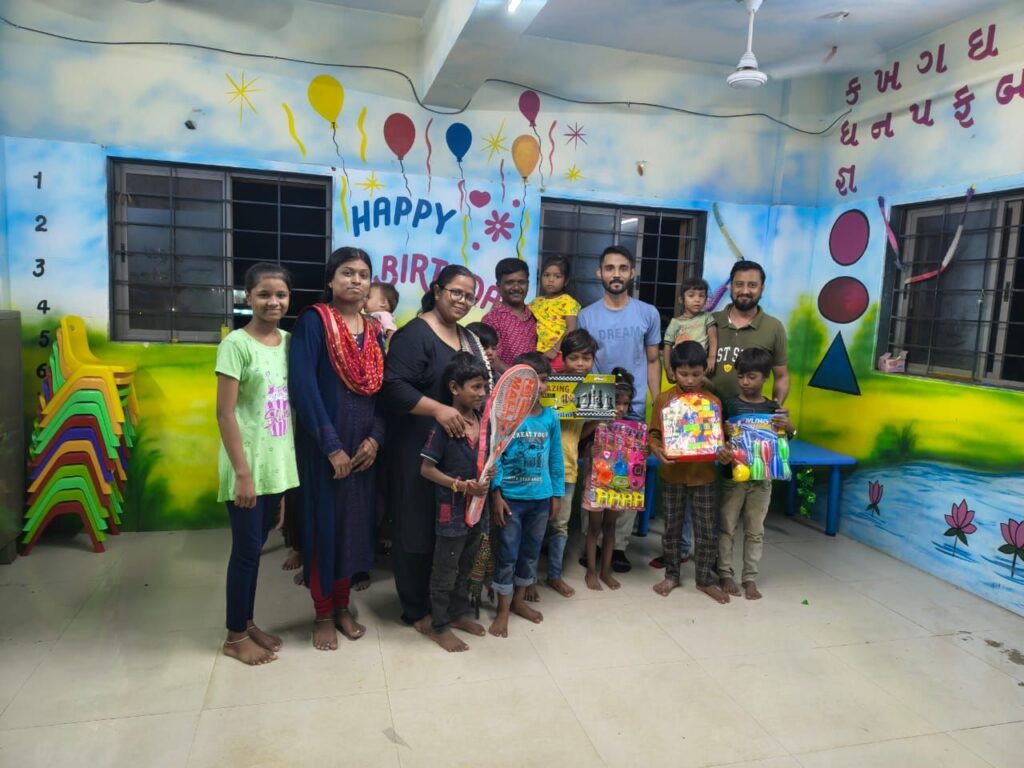 સાથે – સાથે પ્રધાનમંત્રી ટીબી મુકત ભારત અભિયાન અંતર્ગત ટીબીના ૩ દર્દીઓને પોષણ યુક્ત આહાર માટે રાશન કીટ આપી જેથી ટીબીના દર્દી દવાની સાથે સાથે પ્રોટીન યુક્ત ખોરાક લઈ જલદીથી સાજા થઈ શકે. આટલું જ નહીં બાલવાટીકા મહારાણી શ્રી નંદકુંવરબા આશ્રય ગૃહ, રેન બસેરા મોરબી ખાતે નાના ભૂલકાઓના હાથે કેક કપાવી તથા તેઓના સર્વાંગી વિકાસ માટે બ્લોક્સ, ચેસ, ફુલ રેકેટ , કિચન સેટ તથા શૂટ બોલ જેવા રમકડા પણ આપી બાળકોના ચહેરા પર અનોખું સ્મિત લાવ્યું હતું.