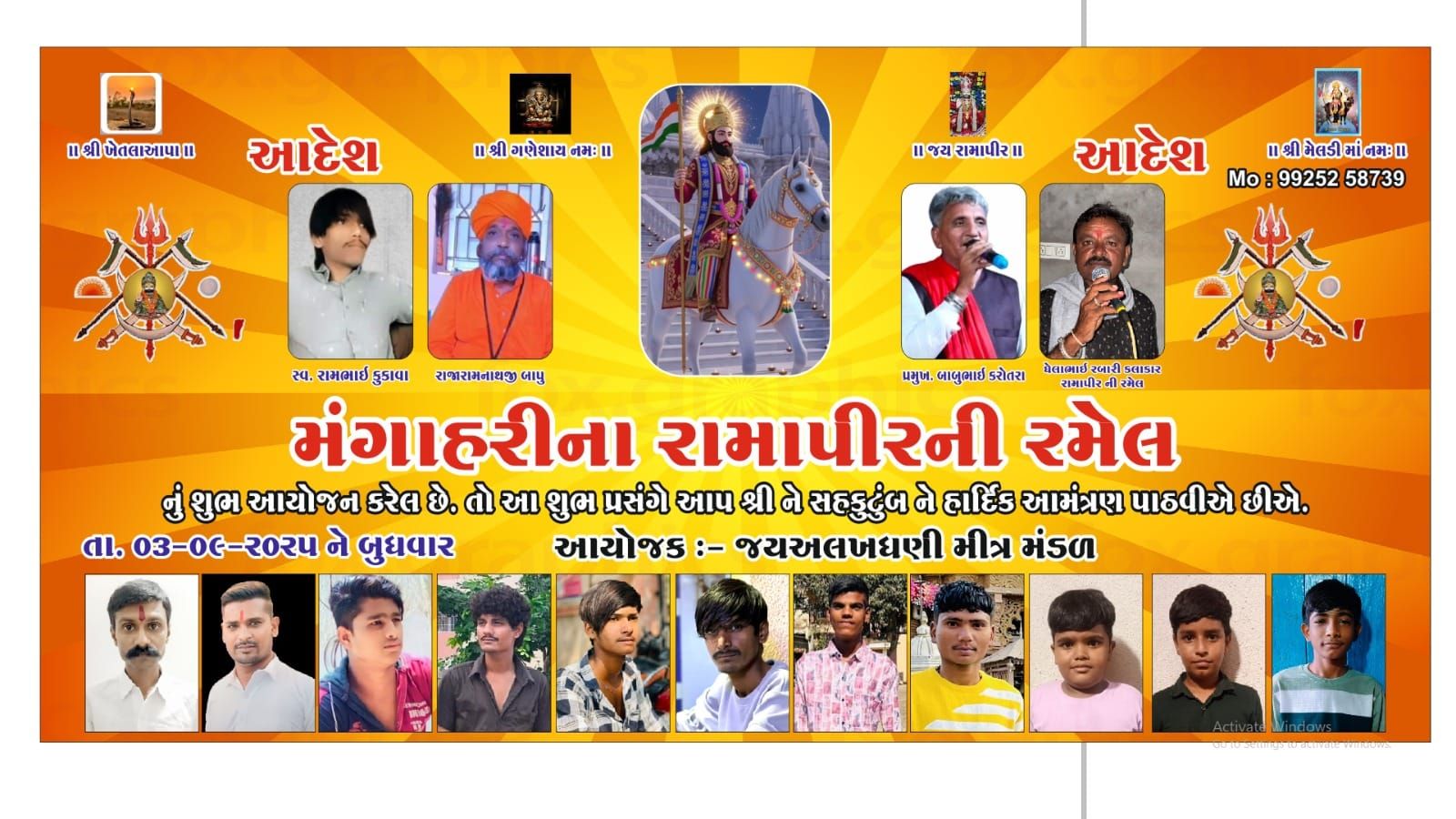 મોરબીના સામાકાંઠે મહેન્દ્રનગર રોડ પર આવેલા રામકૃષ્ણનગર ખાતે આગામી તારીખ 3 સપ્ટેમ્બર ને બુધવારના રોજ જય અલખધણી મિત્ર મંડળ દ્વારા મંગાહરીના રામાપીરની રમેલનું ભવ્ય આયોજન કરવામાં આવ્યું છે.