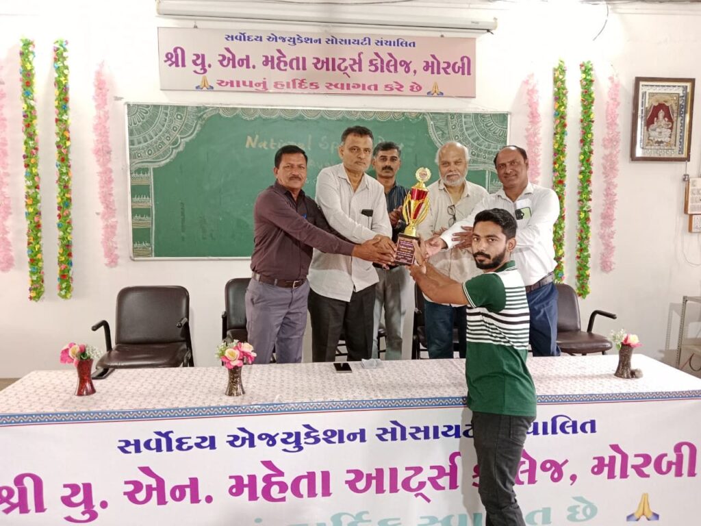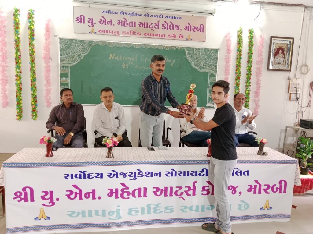 મોરબીની યુ. એન. મહેતા આર્ટ્સ કોલેજ ખાતે 29 અને 30 ઓગસ્ટ 2025ના બે દિવસ રાષ્ટ્રીય ખેલ દિવસની ઉજવણી કરવામાં આવી હતી. જેમાં પ્રથમ દિવસે કોલેજના વિદ્યાર્થીઓએ વિવિધ પરંપરાગત રમતો રમી હતી. અને બીજા દિવસે સેમિનાર હોલમાં રમતગમત સંદર્ભે વક્તવ્યો અને સૌરાષ્ટ્ર યુનિવર્સિટી ખાતે બેડમિન્ટન સ્પર્ધામાં બીજા- ત્રીજા ક્રમે આવેલ વિદ્યાર્થીઓને સન્માનવાનો કાર્યક્રમ યોજાયો હતો.