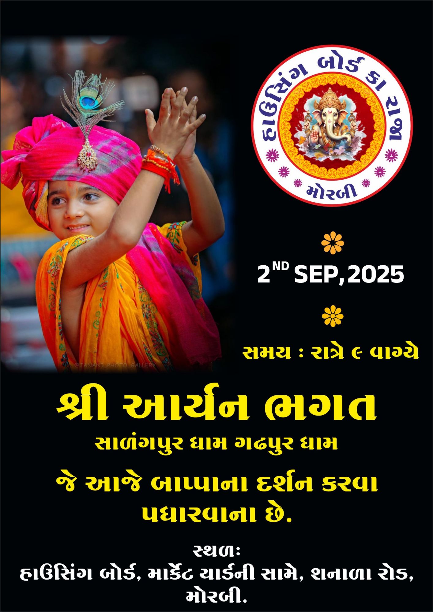 મોરબી : મોરબીના શનાળા રોડ ઉપર આવેલ ન્યુ હાઉસિંગ બોર્ડ ખાતે હાઉસિંગ બોર્ડ કા રાજા નામના ગણેશ મહોત્સવનું સમસ્ત ગુજરાત હાઉસિંગ બોર્ડ વિસ્તાર દ્વારા અયોજન કરવામાં આવ્યું છે. જેમાં દરરોજ વિધ્નહર્તાની પૂજા અર્ચના, આરતી કરીને આરાધના કરવામાં આવે છે. ત્યારે આ ન્યુ હાઉસિંગ બોર્ડ કા નામના ગણેશ મહોત્સવમાં આજે રાત્રે સાળગપુર ધામ ગઢપુર ધામના આર્યન ભગન ગણપતિ બાપ્પાના દર્શનાર્થે પધારશે. તેથી આજે રાત્રે આર્યન ભગત અને જુનિયર કલાકારોના મિમિક્રી શો એમ બે કાર્યક્રમનો દરેક લોકોને લાભ લેવા ભાવભીનું નિમંત્રણ પાઠવ્યું છે.