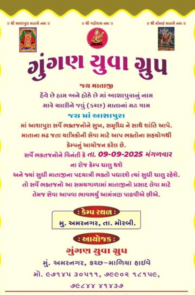 સતત છેલ્લા 17 વર્ષ થી કચ્છ માતાના મઢ જતા પદયાત્રીઓ માટે માળિયા હાઈવે પર આવતા અમરનગર ગામ ના પાટિયે આ સેવા કેમ્પ નુંઆયોજન કરવામાં આવે છે.દર વર્ષની જેમ આ વર્ષે પણ આ કેમ્પનું આયોજન છે. કેમ્પ ૦૯/૦૯/૨૦૨૫થી લઈને પદયાત્રીઓ ભકતો પધારશે ત્યાં સુધી કેમ્પ શરુ રહેશે.