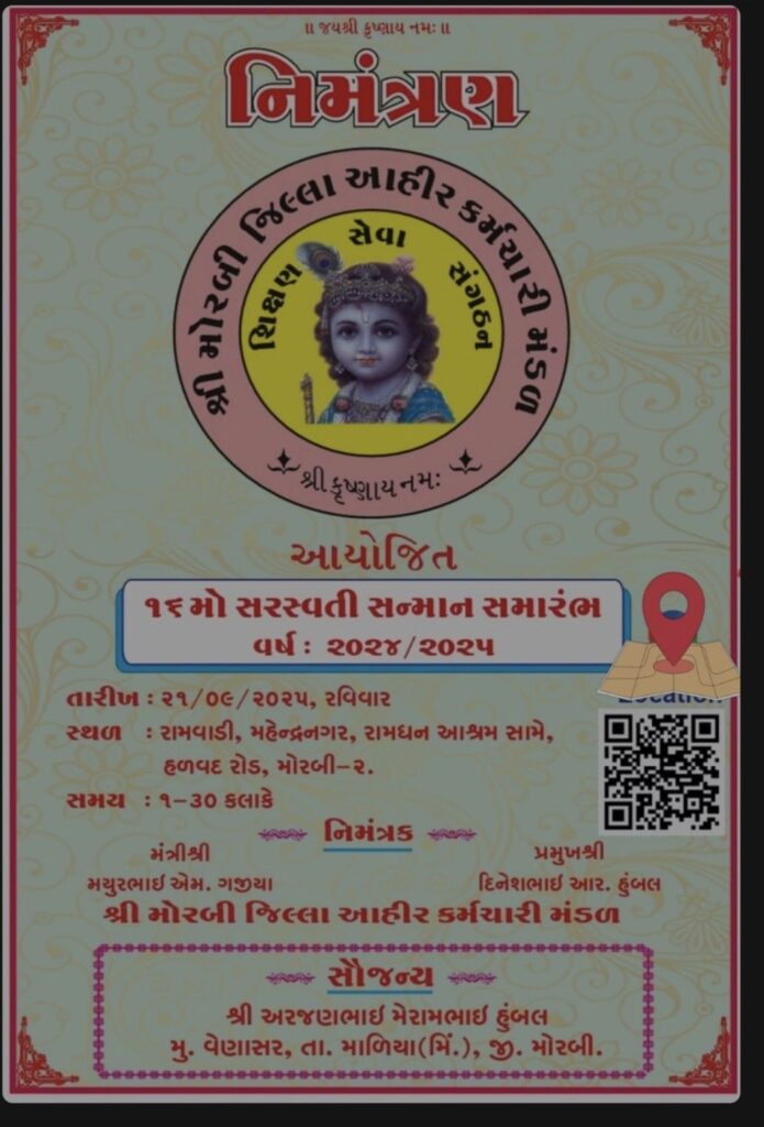 આ સરસ્વતી સન્માન સમારોહમાં મોરબી જિલ્લા વિસ્તારના સમસ્ત આહીર સમાજના વિદ્યાર્થીઓને તથા વર્ગ-1 અને વર્ગ-2ના કર્મચારીઓ તથા નિવૃત્ત કર્મચારીઓને સન્માનિત કરવામાં આવશે. કાર્યક્રમના અધ્યક્ષ તરીકે વવાણિયા માતૃશ્રી રામબાઈ માની જગ્યાના મહંત પ્રભુદાસજી મહારાજ ઉપસ્થિત રહેશે. દિપ પ્રાગટ્ય રામધન આશ્રમના મહંત ભાવેશ્વરીબેન તથા મયુરનગર માતૃશ્રી રામબાઈ મા મંદિરના મહંતા વ્રજકિશોરીબેન કરશે. કાર્યક્રમના મુખ્ય વક્તા તરીકે ગુજરાત આહીર કેળવણી મંડળના પ્રમુખ પ્રવિણભાઈ ભેડા હાજર રહેશે. આ ઉપરાંત સમાજના અનેક અગ્રણીઓ ઉપસ્થિત રહેશે. કાર્યક્રમના સૌજન્ય વેણાસરના વતની અરજણભાઈ મેરામભાઈ હુંબલ છે. તો આ કાર્યક્રમમાં પધારવા સમસ્ત આહીર સમાજના પરિવારોને મંત્રી મયુરભાઈ ગાજીયા અને પ્રમુખ દિનેશભાઈ હુંબલ દ્વારા નિમંત્રણ પાઠવાયું છે.