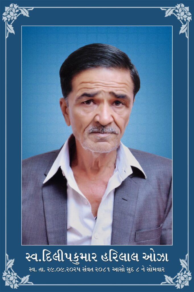 મોરબી : મોરબી નિવાસી દિલીપભાઈ હરિલાલ ઓઝા તે સ્વ.રવિભાઈ ઓઝા , ગોપાલભાઈ ઓઝાના પિતા તથા યાશી, નવ્યા,માનું, નિત્યા દાદાનું તારીખ 29/9/25 ના રોજ અવસાન થયું છે. સદગતનુ બેસણું તારીખ 2/10/25 ગુરુવરના રોજ બપોરે 3 થી 5 કાલિકા પ્લોટ ,રાજ બેન્કવાળી શેરી રવાપર રોડ તેમના નિવાસસ્થાને રાખેલ છે મો.9714744443,9913580166