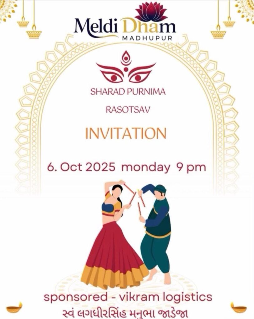 મધુપુર: શરદ પૂનમની ઉજવણીના ભાગરૂપે મેલડીધામ મધુપુર મંદિર ટ્રસ્ટ દ્વારા બહેનો અને દીકરીઓ માટે ભવ્ય રાસ-ગરબાના ઉત્સવનું આયોજન કરવામાં આવ્યું છે. આ આયોજન 06/10/2025ને સોમવારના રોજ રાત્રે 09:00 કલાકે મેલડીધામ મધુપુર ખાતે કરાયું છે.