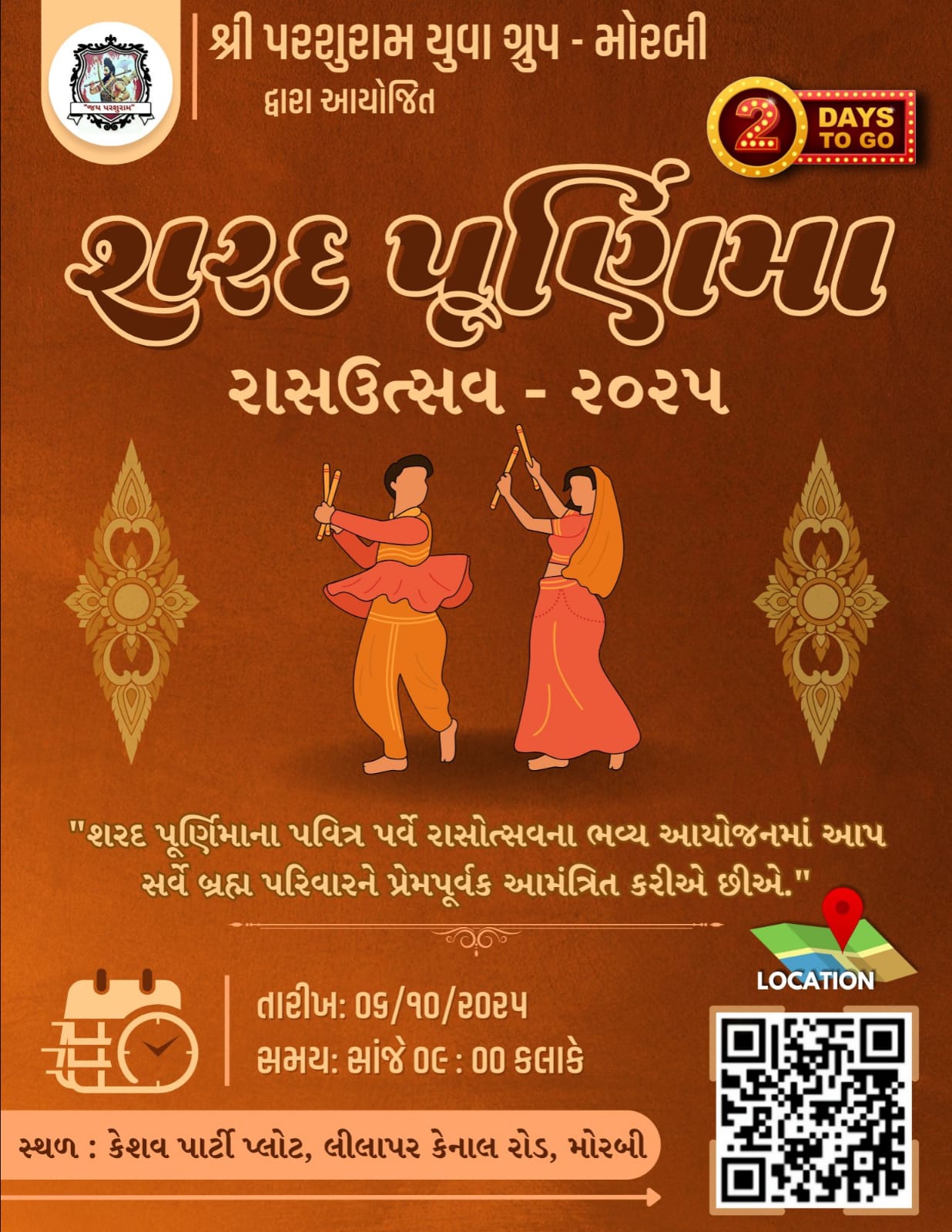 મોરબી : આગામી તારીખ 6 ઓક્ટોબરને સોમવારે શરદ પૂર્ણિમા નિમિત્તે પર પરશુરામ યુવા ગ્રુપ મોરબી દ્વારા ભવ્ય રાસોત્સવનું આયોજન કરવામાં આવ્યું છે. આ રાસોત્સવ સોમવારે રાત્રે 9 કલાકે મોરબીના લીલાપર કેનાલ રોડ પર આવેલા કેશવ પાર્ટી પ્લોટ ખાતે યોજાશે.