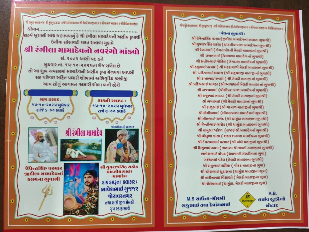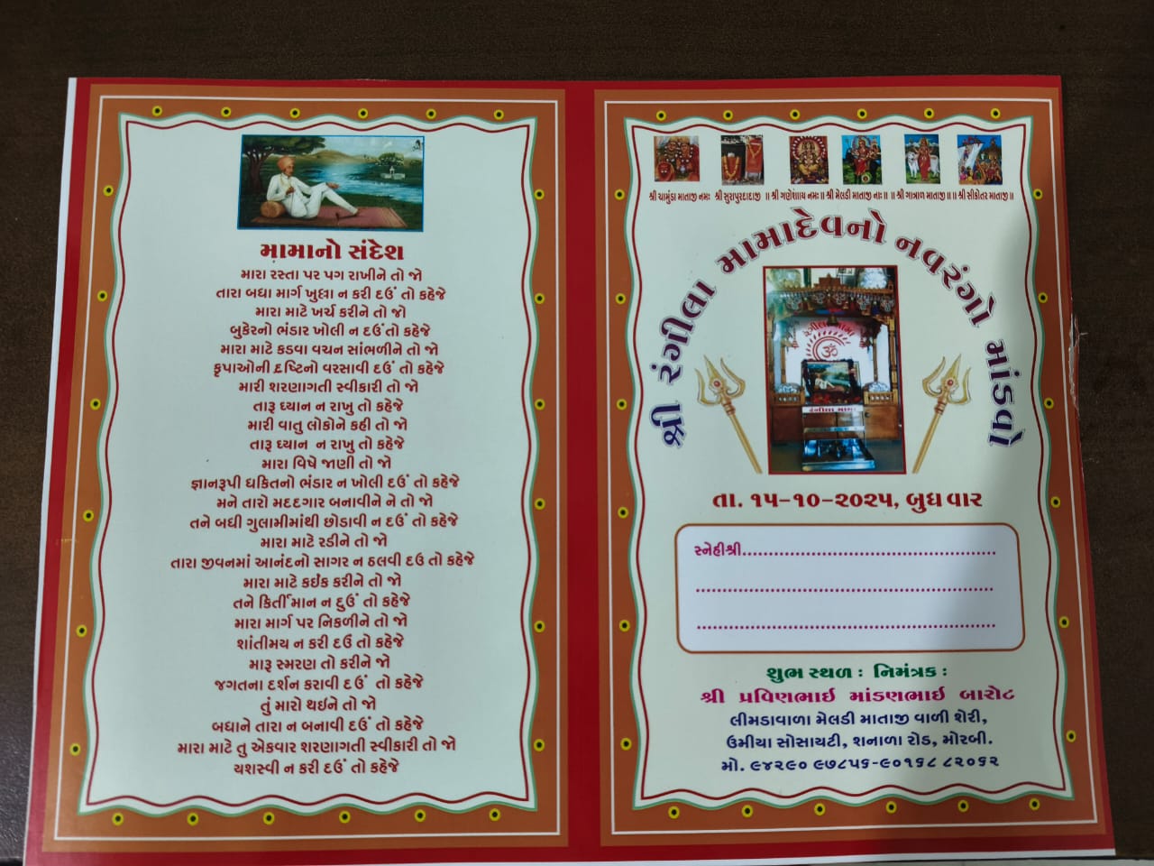 મોરબી : શ્રી રંગીલા મામાદેવ મિત્ર મંડળ દ્વારા તા. ૧૫ ને બુધવારના રોજ શનાળા, લીમડાવાળા મેલડી મંદિર પાછળ ઉમિયાનગર સોસાયટી મોરબી ખાતે શ્રી રંગીલા મામાદેવનો નવરંગો માંડવો યોજાશે જેમાં તા.૧૫ ને બુધવારે સવારે મામાદેવનું મહાપૂજન, સાંજે ૬ કલાકે ઉમિયાનગર શકત શનાળા ખાતે મહાપ્રસાદ અને રાત્રે ૯ કલાકે ડાક ડમરૂ કાર્યક્રમ યોજાશે જે મહોત્સવમાં કલમના ભુવાશ્રી ઉપેન્દ્રસિંહ પરમાર, રાવળદેવ શ્રી ભાવેશભાઈ ગુજજર તથા સાથી ગ્રુપ અને શ્રી ચાંદલિયાવાળા મામાદેવના ભુવાશ્રી યુવરાજસિહ રાઠોડ તેમજ પંચના ભૂવાઓ ઉપસ્થિત રહેશે. જે ધાર્મિક મહોત્સવનો લાભલેવા શ્રી રંગીલા મામાસાહેબ યુવા ગ્રુપ શકત શનાળા તેમજ પ્રવીણભાઈ બારોટ દ્વારા જાહેર નિમંત્રણ પાઠવ્યું છે.