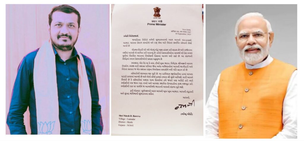 મોરબી: વડાપ્રધાન નરેન્દ્રભાઈ મોદીના જન્મદિવસ નિમિતે મોરબી તાલુકા ભાજપ ઉપપ્રમુખ નિતેશભાઈ બાવરવાએ પત્ર લખીને વડાપ્રધાનને શુભેચ્છાઓ પાઠવી હતી. ત્યારે વડાપ્રધાન નરેન્દ્ર મોદીએ નિતેશ બાવરવાને પત્ર લખીને આભાર વ્યક્ત કર્યો છે.