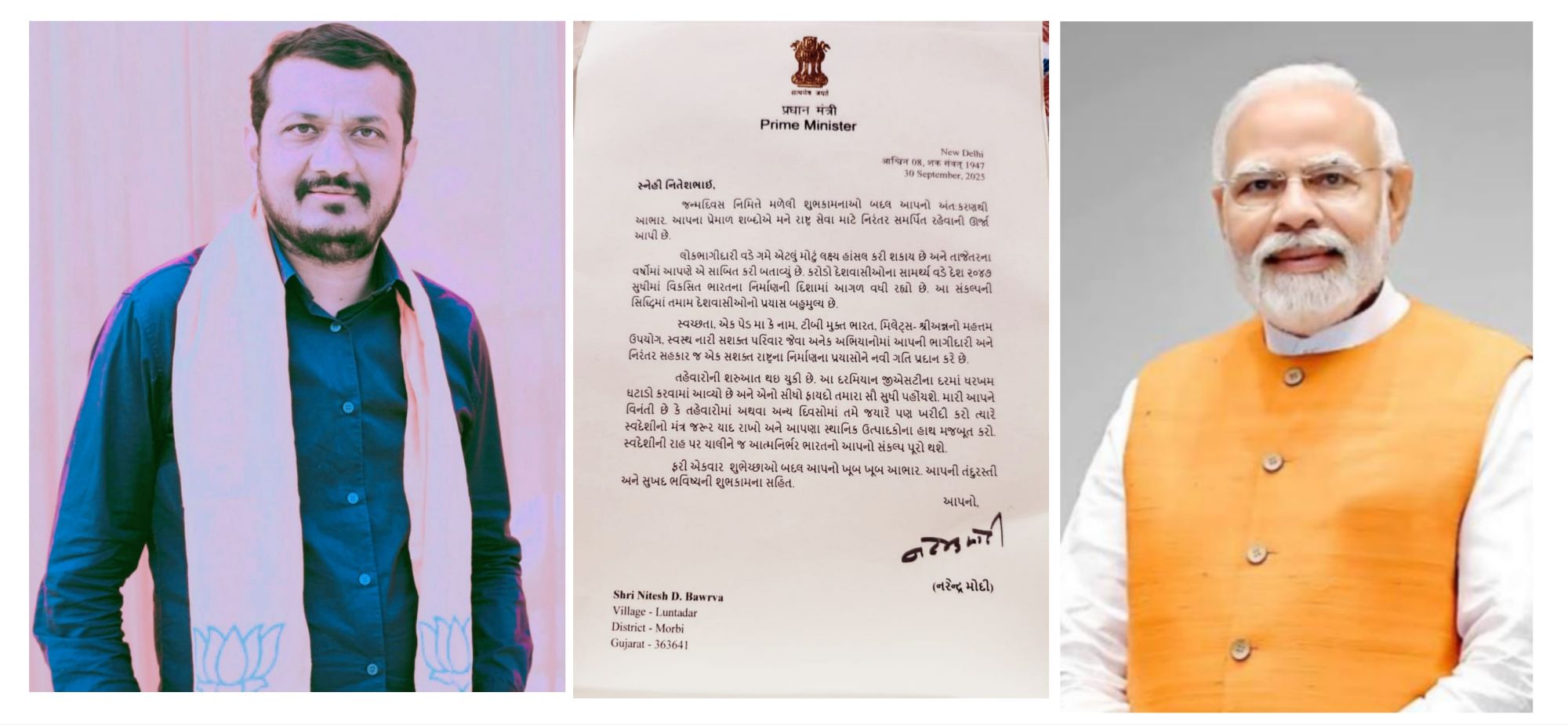 વડાપ્રધાન નરેન્દ્ર મોદીએ નિતેશ બાવરવાને પત્ર લખીને આભાર વ્યક્ત કરતા જણાવ્યું હતું કે, જન્મદિવસ નિમિત્તે મળેલી શુભકામનાઓ બદલ આપનો અંત:કરણથી આભાર. આપના પ્રેમાળ શબ્દોએ મને રાષ્ટ્ર સેવા માટે નિરંતર સમર્પિત રહેવાની ઊર્જા આપી છે. લોકભાગીદારી વડે ગમે એટલું મોટું લક્ષ્ય હાંસલ કરી શકાય છે અને તાજેતરના વર્ષોમાં આપણે એ સાબિત કરી બતાવ્યું છે. કરોડો દેશવાસીઓના સામર્થ્ય વડે દેશ ૨૦૪૭ સુધીમાં વિકસિત ભારતના નિર્માણની દિશામાં આગળ વધી રહ્યો છે. આ સંકલ્પની સિદ્ધિમાં તમામ દેશવાસીઓનો પ્રયાસ બહુમુલ્ય છે.