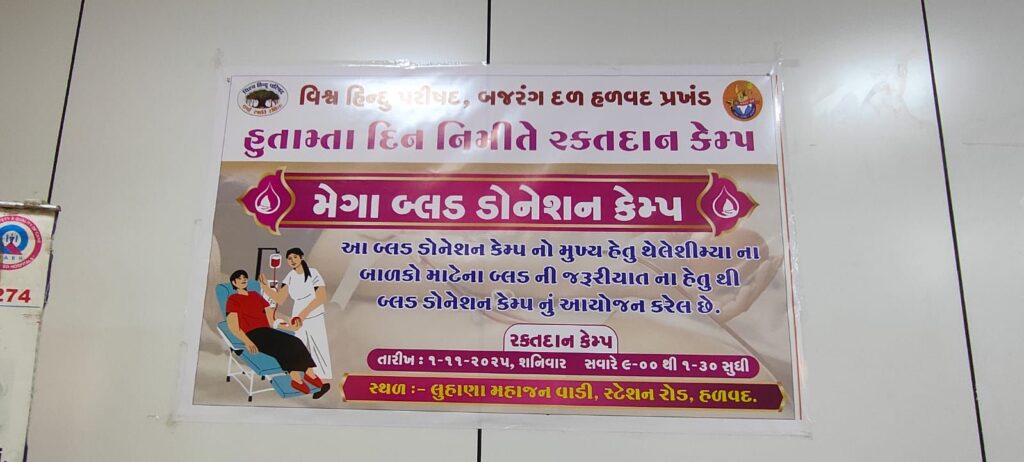 અયોધ્યા રામ જન્મભુમી મુક્તિ આંદોલન માં ૩૦ ઓક્ટોબર – ૨ નવેમ્બર ૧૯૯૦ ની પ્રથમ કાર સેવામાં તત્કાલીન સરકાર દ્રારા નિદોર્ષ કાર સેવકો ઉપર ગોળીબાર કરી નિર્મમ હત્યાઓ કરેલ આ નવસન્સ હત્યાકાંડ માં બલીદાન થનાર વિર હુતાત્માઓની યાદમાં બજરંગદળ દ્રારા ભારતભરમાં તા. ૩૦ થી ૨ નવેમ્બર સુધી રક્તદાન કેમ્પ કરવામાં આવે છે. એના ભાગરૂપે હળવદ પ્રખંડમાં તા. ૧ નવેમ્બર ૨૦૨૫ ને શનિવાર ના રોજ મેગા રક્તદાન કેમ્પ ૧૫૦ થી વધું બ્લડ એકત્રિત થયું હતું, સાથે સાથે હળવદ તાલુકાની જનતાની સેવામાં દાતાશ્રીઓના સહયોગથી એમ્બુલન્સનું લોકાપર્ણ કરવામાં આવ્યું હતું,