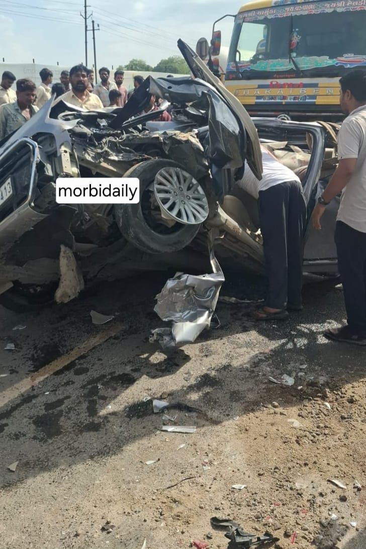 વાંકાનેરમાં આવેલ વિવેકાનંદ સોસાયટીમાં રહેતા ભાવિનભાઈ ઉર્વીશભાઈ રાવલ (ઉ.વ.35) તેમના પત્ની ધારાબેન ભાવિનભાઈ રાવલ (ઉ.વ.35) અને તેનો દીકરો નીલ ભાવિનભાઈ રાવલ (ઉ.વ. 6) વાંકાનેરથી દર્શન કરવા માટે થઈને મોરબી તરફ આવી રહ્યા હતા. તે દરમિયાન લાલપર ગામ પાસે ભાવિનભાઇની કાર નંબર જીજે 36 એસી 9493 લાલપર ગામ નજીક આવેલ ગોલ્ડ સિરામિકની સામેથી પસાર થઈ રહી હતી ત્યારે અકસ્માત થયો હતો. જે બનાવમાં કાર બે ડમ્પર વચ્ચે આવી ગઈ હતી જેથી કરીને કારનો ભુક્કો બોલી ગયો હતો અને કારમાં બેઠેલ ત્રણ વ્યક્તિ પૈકી મહિલાને ગંભીર ઇજા થઈ હતી જેથી કરીને તેને તાત્કાલિક હોસ્પિટલે લઈ ગયા હતા અને અકસ્માત થયેલ કારને ક્રેનની મદદથી રોડ સાઈડમાં કરીને રોડ ઉપર ટ્રાફિક પૂર્વવત કરવામાં આવ્યો હતો. હાલમાં મોરબી તાલુકા પોલીસ સ્ટેશન ખાતેથી મળતી વિગત પ્રમાણે અકસ્માતના આ બનાવમાં ઈજા પામેલ ધારાબેન ભાવિનભાઈ રાવલનું સારવાર દરમિયાન મોત નિપજયુ છે જેથી કરીને અકસ્માત મૃત્યુના આ બનાવ સંદર્ભે ફરિયાદ લેવા માટેની તજવીજ હાથ કરવામાં આવી છે.