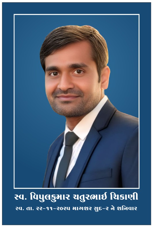 મોરબી નિવાસી વિપુલકુમાર ચતુરભાઈ ચિકાણી તેઓ ચતુરભાઈ રાઘવજીભાઈ ચીકાણી અને પ્રભાબેન ચતુરભાઈ ચીકાણીના પુત્ર તેમજ લાલજીભાઈ રાઘવજીભાઈ ચીકાણી તથા લાભુબેન લાલજીભાઈ ચીકાણી અને અશોકભાઈ રાઘવજીભાઈ ચીકાણી તથા રેખાબેન અશોકભાઈ ચીકાણીના ભત્રીજા તેમજ હર્ષાબેન વિપુલભાઈ ચીકાણીના પતિ તથા હેતવી ચીકાણી, હાર્વી ચીકાણી અને ભવ્ય ચીકાણીના પિતાનું 22/11/2025 ને શનિવારના રોજ અવસાન થયું છે. સદગતનું બંને પક્ષનું બેસણું 24/11/2025 ના રોજ સવારે 8 થી 10 કલાકે તેમના નિવાસસ્થાન સંકેત પેલેસ, વૃંદાવન પાર્ક, રામકો બંગલોની પાછળ, લીલાપર કેનાલ રોડ, મોરબી ખાતે તેમજ બપોરે 3 થી 5 વાગ્યા સુધી જેતપર (મચ્છુ) શિવ મંદિર ખાતે રાખવામાં આવ્યું છે.