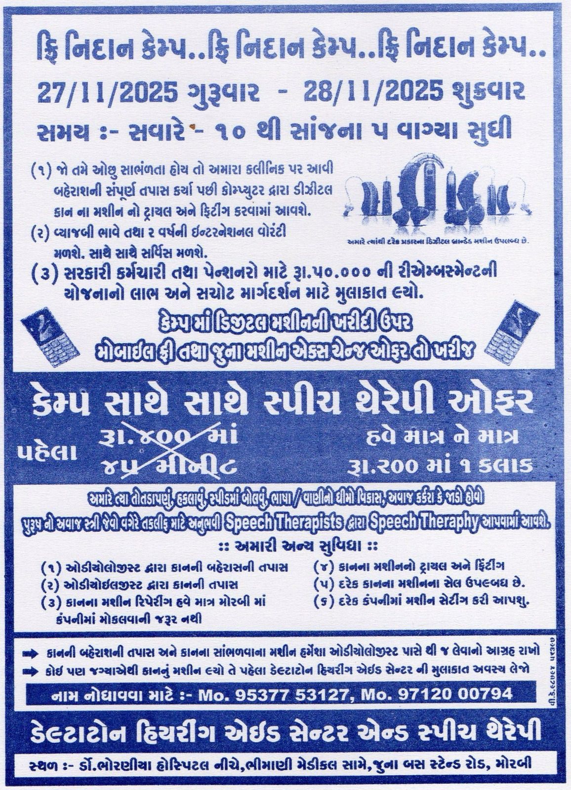 મોરબી શહેરમાં ડેલ્ટાટોન હિયરીંગ એઈડ સેન્ટર એન્ડ સ્પીચ થેરાપી દ્વારા આવનાર 27 અને 28 નવેમ્બર 2025ના રોજ સવારે 10:00 થી સાંજે 5:00 વાગ્યા સુધી બે દિવસીય મફત નિદાનકેમ્પનું આયોજન કરવામાં આવ્યું છે. આ કેમ્પનો મુખ્ય ઉદ્દેશ બહેરાશ તથા વાણી સંબંધિત તકલીફો અંગે લોકોમાં જાગૃતિ લાવવાનો તથા નિદાનની આધુનિક અને સુલભ સુવિધા પ્રદાન કરવાનો છે.