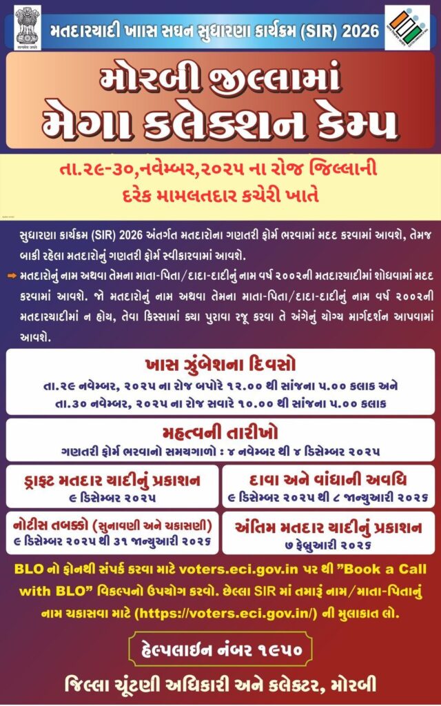 નાગરિકોની સુવિધા માટે મોરબી જિલ્લાના ત્રણેય વિધાનસભા મતવિસ્તાર – 65-મોરબી, 66-ટંકારા અને 67-વાંકાનેર – માં તારીખ 29 અને 30 નવેમ્બર, 2025ના રોજ ખાસ કેમ્પોનું આયોજન કરવામાં આવ્યું છે. જિલ્લાના તમામ મતદારોને આ કેમ્પની મુલાકાત લઈને તેમના ફોર્મ્સ જમા કરાવવા માટે જિલ્લા ચૂંટણી અધિકારી દ્વારા અનુરોધ કરવામાં આવ્યો છે.