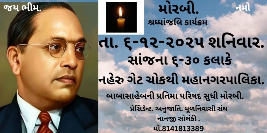 મોરબી: અનુસૂચિત જાતિ, મૂળનિવાસી સંઘ-મોરબી દ્વારા મહામાનવ ડૉ. બાબાસાહેબ આંબેડકરના 69મા મહાપરિનિર્વાણ દિન નિમિત્તે મોરબી શહેરમાં શ્રદ્ધાંજલિ કાર્યક્રમનું આયોજન કરવામાં આવ્યું છે.