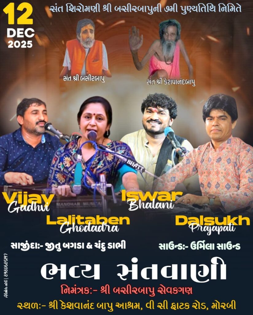 મોરબી : સંત શિરોમણી શ્રી બસીરબાપુની પુણ્યતિથિ નિમિતે તા. 12-12-2025ના રોજ શ્રી કેશવાનંદ બાપુ આશ્રમ, વી. સી. ફાટક રોડ, મોરબી ખાતે ભવ્ય સંતવાણીનું આયોજન કરવામાં આવ્યું છે. આ સંતવાણીમાં ઊર્મિલા સાઉન્ડના સથવાળે ભજનિક વિજય ગઢવી, લલીતાબેન, ઈશ્વર ભાલાણી અને દલસુખ પ્રજાપતિ ભજનની રમઝટ બોલાવશે.