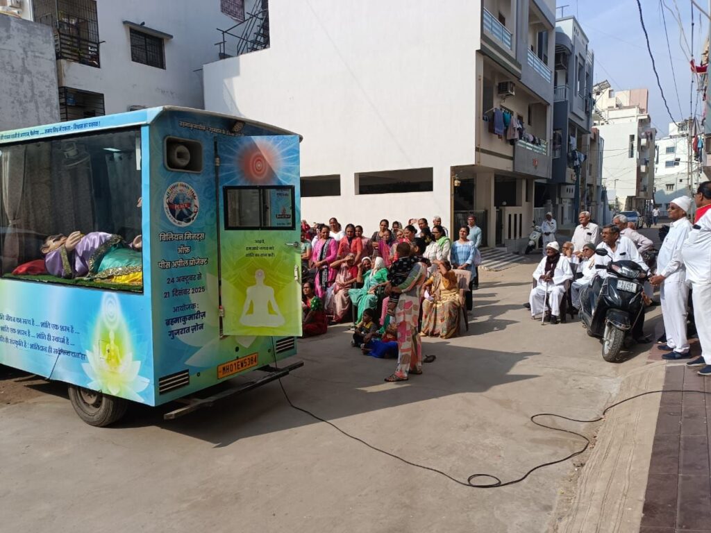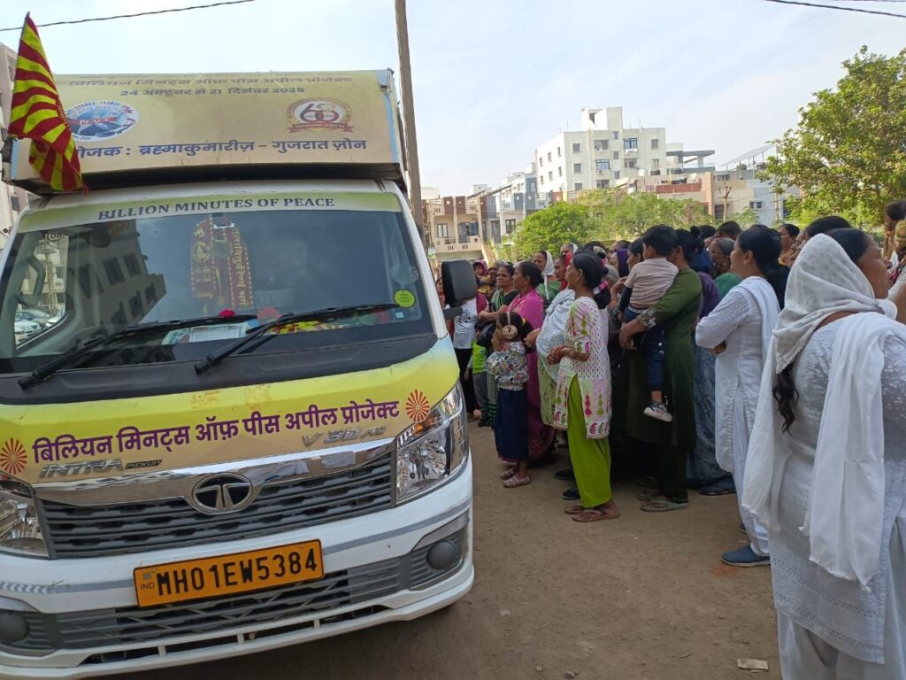 પ્રજાપિતા બ્રહ્માકુમારી દ્વારા આગામી 21 ડિસેમ્બર વિશ્વ ધ્યાન દિવસ નિમિત્તે ‘બિલિયન મિનિટ્સ ઓફ પીસ અપિલ’ પ્રોગ્રામનું અમદાવાદ ગુજરાત યુનિવર્સિટી ગ્રાઉન્ડ ખાતે આયોજન થવા જઈ રહ્યું છે. આ પ્રોગ્રામના ભાગરૂપે સમગ્ર વિશ્વમાં શાંતિ સ્થપાઈ એવા શુભ હેતુથી આખા ગુજરાતમાં એક શાંતિ રથ ગામો ગામ ફરી રહ્યો છે. લોકોને આ અશાંતિના વાતાવરણમાંથી બહાર નીકળી, શાંત ચિત બની, પોતાનું મન શાંત બને અને સમગ્ર વિશ્વમાં શાંતિનું દાન આપે એવા હેતુથી બે દિવસથી આ શાંતિ રથ મોરબીમાં ફરી રહ્યો છે, અને લોકોમાં વિશ્વ શાંતિ માટે જાગૃતિ ફેલાવી રહ્યો છે.