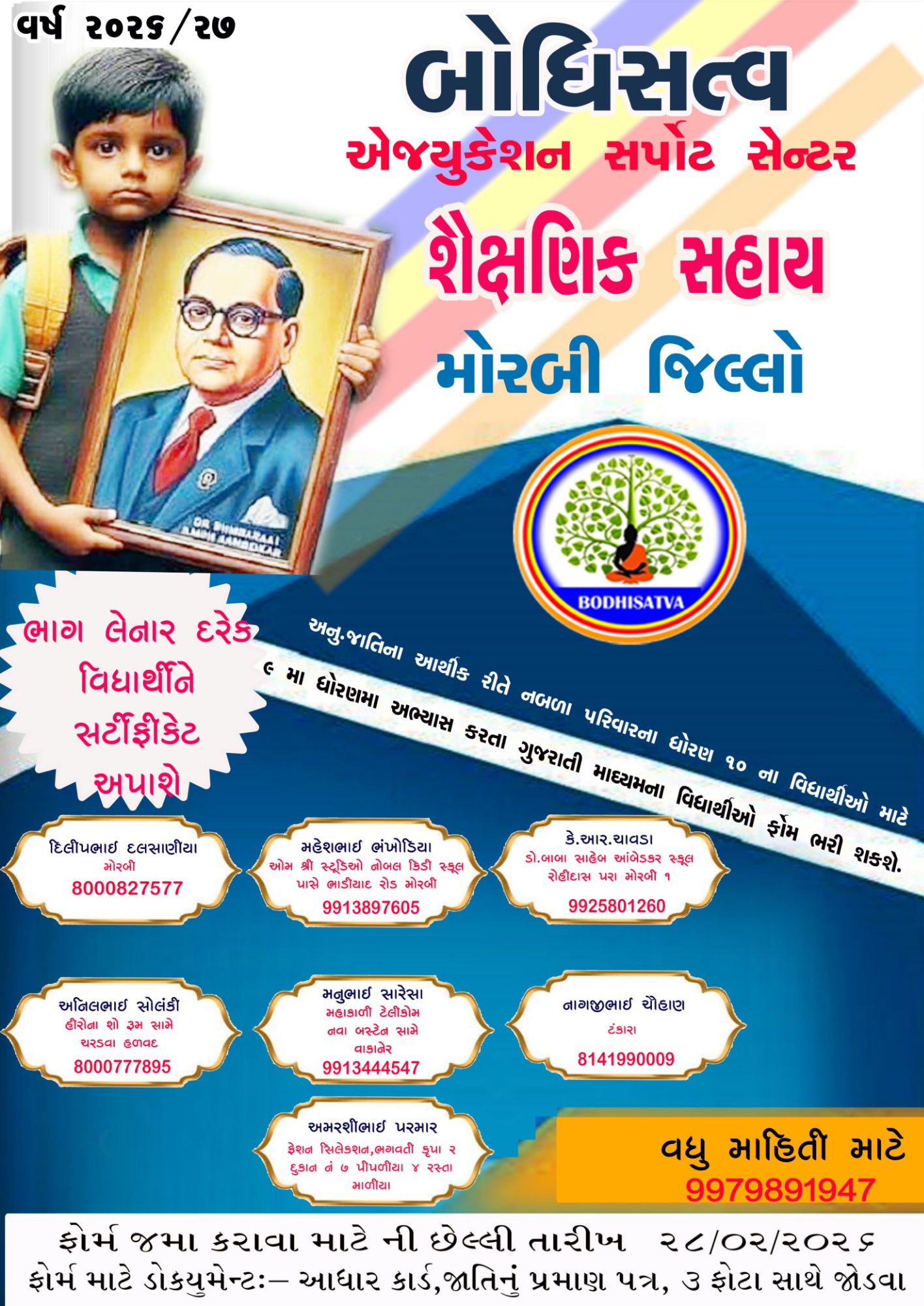 મોરબી: બોધિસત્વ ટ્રસ્ટ જામનગર દ્વારા જામનગર દેવ ભૂમિ દ્વારકા અને મોરબી જિલ્લા ખાતે વિવિધ શૈક્ષણિક પ્રવૃત્તિઓ કરવામાં આવે છે. જેમાં લાઇબ્રેરી, કોમ્પ્યુટર ક્લાસ, મેડિકલ સહાય, સ્પર્ધાત્મક પરીક્ષાના ફ્રી વર્ગો, શૈક્ષણિક સહાય જેવી પ્રવૃત્તિઓ કરવામાં આવે છે. જેના અનુસંધાને હાલ સંસ્થા દ્વારા મોરબી, જામનગર અને દેવભૂમિ દ્વારકાનાં ધોરણ 10માં અભ્યાસ કરતા વિદ્યાર્થીઓને શૈક્ષણિક સહયોગ આપવાનું નક્કી કરેલ છે જેમની પરીક્ષા માટેનાં ફોર્મ મોરબી ખાતેથી મળી રહેશે. જેમાં હાલ 9માં ધોરણમાં અભ્યાસ કરતા ગુજરાતી માધ્યમનાં અનુ.જાતિ સમાજના મોરબી અને અન્ય બે જિલ્લાઓના વિદ્યાર્થીઓ તારીખ 28/02/2025 સુધી વિનામૂલ્યે ફોર્મ મેળવી જમાં કરાવી આપવાના રહેશે.