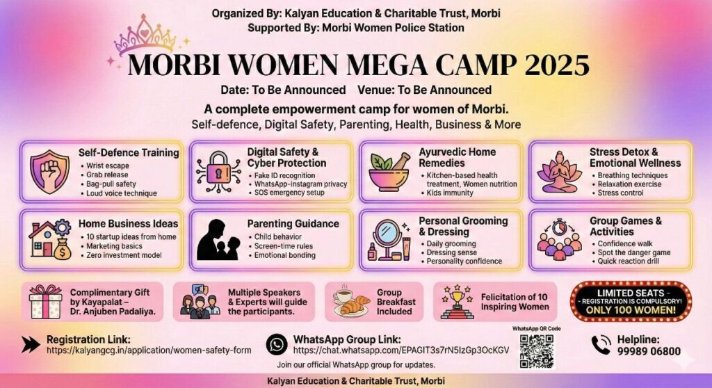 મોરબી શહેરમાં મહિલાઓ માટે એક ઐતિહાસિક અને અનોખું આયોજન થવા જઈ રહ્યું છે. મહિલાઓની સુરક્ષા, સ્વાસ્થ્ય, આત્મવિશ્વાસ, આર્થિક સ્વાવલંબન અને માનસિક શક્તિને કેન્દ્રમાં રાખીને “Women Empowerment Mega Camp – 2026” નું આયોજન કરવામાં આવ્યું છે. આ કાર્યક્રમ Kalyan Education & Charitable Trust – Morbi દ્વારા આયોજિત છે અને મોરબીમાં પહેલી વખત આટલી વ્યાપક સ્તરે મહિલાઓ માટે સંપૂર્ણ પ્રેક્ટિકલ આધારિત કેમ્પ યોજાઈ રહ્યો છે.