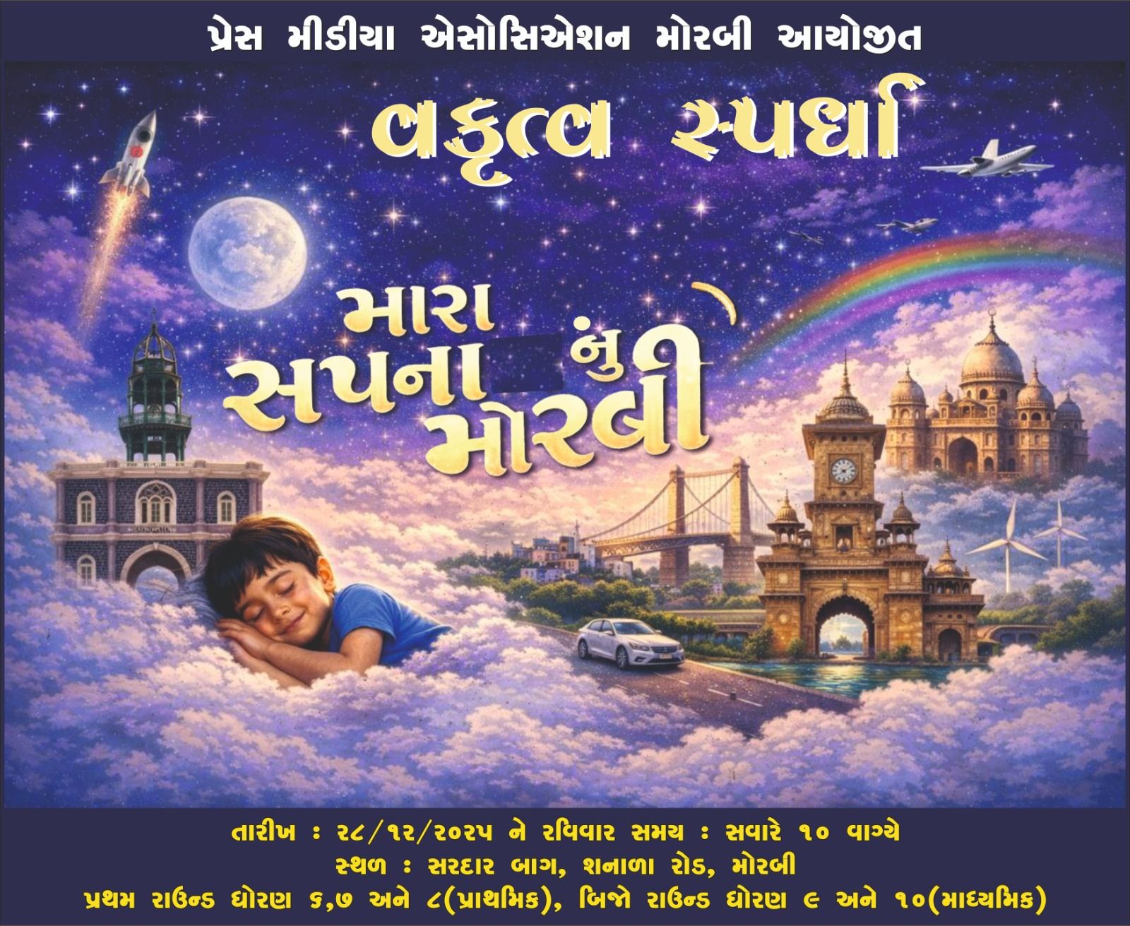 પત્રકારત્વની સાથે સાથે સામાજિક લેવલે પણ પોતાની જવાબદારી સમજનાર પ્રેસ મીડિયા એસોસિએશન મોરબી દ્વારા વકૃત્વ સ્પર્ધાનું આયોજન કરવામાં આવી રહ્યું છે. આ આયોજનમાં ધોરણ ૬,૭ અને ૮(પ્રાથમિક) તેમજ ધોરણ ૯ અને ૧૦(માધ્યમિક) માં અભ્યાસ કરતા બાળકો ભાગ લઈ શકશે. આયોજન નો મુખ્ય હેતુ મોરબી મહાનગરપાલિકા જ્યારે એક વર્ષ પૂર્ણ કરી બીજા વર્ષમાં પ્રવેશ કરી રહી છે ત્યારે આવનાર સમયમાં મોરબી નું ભવિષ્ય જેમના હાથોમાં છે તેવા બાળકો કઈ પ્રકારનું મોરબી ઇચ્છી રહ્યા છે તેને ઉજાગર કરવાનો છે.
