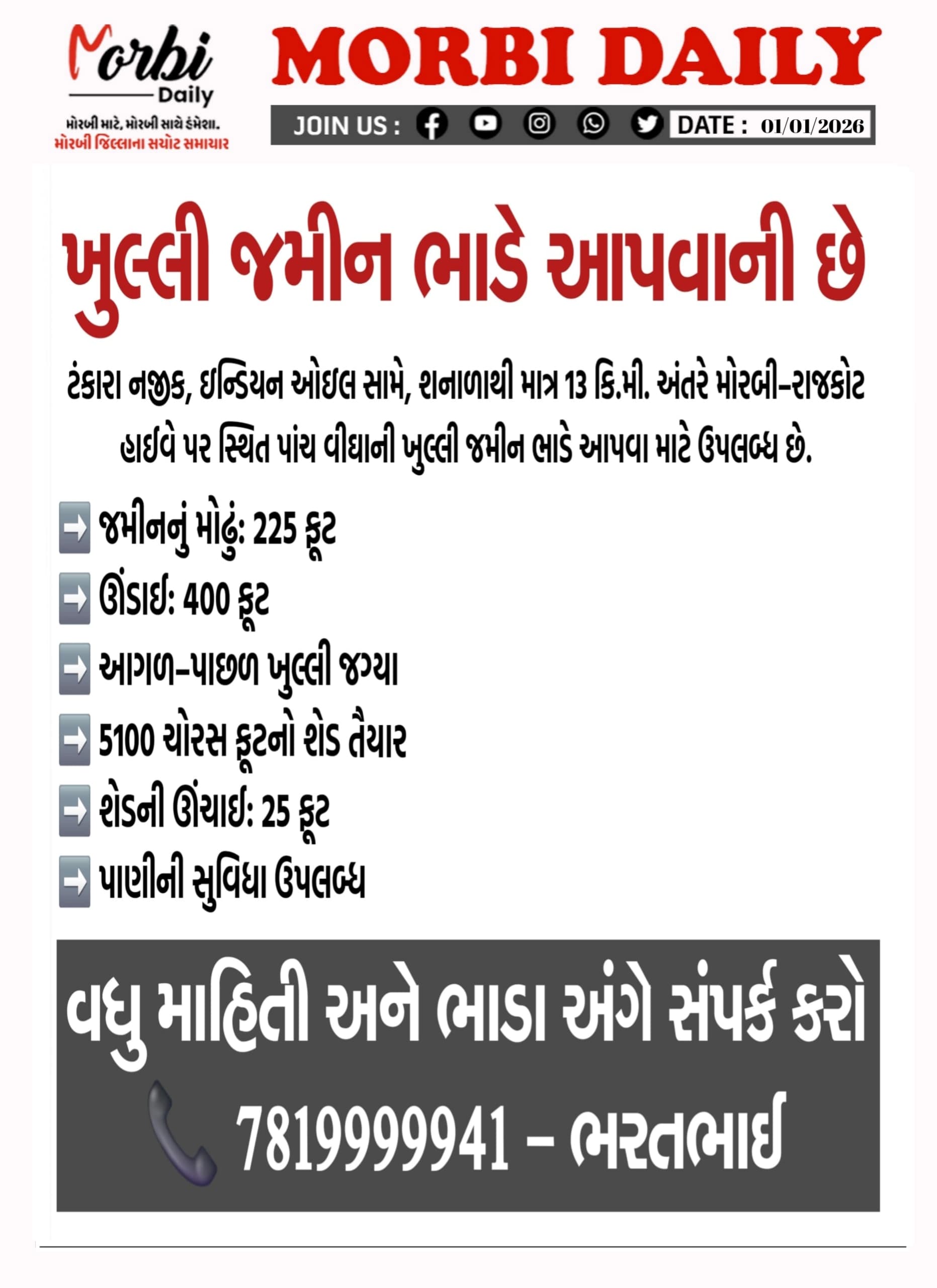 મોરબી : મોરબીમાં કુદરતી અને ઓર્ગેનિક ઉત્પાદનોના પ્રચાર-પ્રસાર માટે કાર્યરત હરડે પ્રચાર કેન્દ્ર (મોરબી) દ્વારા આવતીકાલે રવિવારે, તારીખ 4 જાન્યુઆરી, 2026 ના રોજ વિશેષ વેચાણ કેન્દ્રનું આયોજન કરવામાં આવ્યું છે. આ વેચાણ સવારે 8 થી બપોરના 12 વાગ્યા સુધી માર્કેટિંગ યાર્ડની બહારની બાજુએ, આર.ડી.સી. બેન્કના દરવાજા પાસે, ન્યુ હાઉસિંગ બોર્ડની સામે, શનાળા રોડ, મોરબી ખાતે યોજાશે.