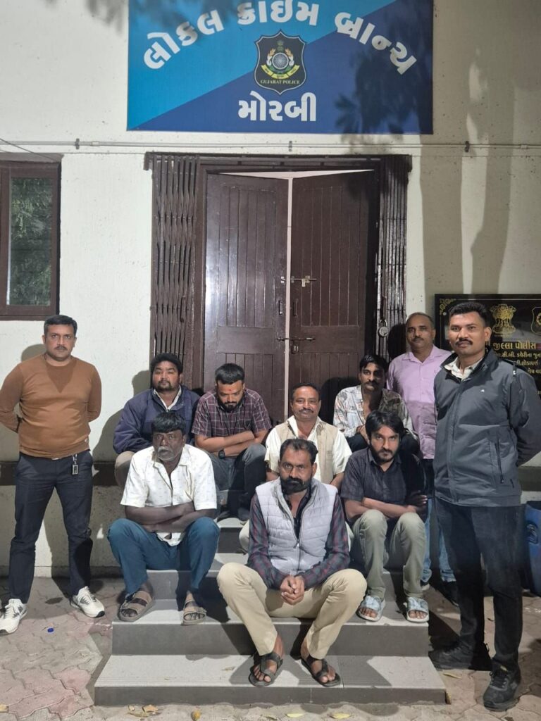 મોરબી : મોરબી LCB તથા પેરોલ ફર્લો સ્કવોડને ખાનગીરાહે બાતમી મળી હતી કે, મનસુખભાઈ બાબુભાઈ જીલરીયા રહે.નાની વાવડી ભક્તિ સોસાયટી તા.જી.મોરબીવાળો જે માનસર ગામની સીમ માનસર તથા નારણકા ગામ જવાના જુના કાચા માર્ગપર આવેલ પોતાના કબ્જા ભોગવટાવાળી વાડીની અંદર બનાવેલ પ્લાસ્ટીકના તંબુમાં બહારથી માણસો બોલાવી તીન પતીનો જુગાર રમી રમાડી નાલ ઉઘરાવી જુગારનો અખાડો ચલાવે છે.તેવી બાતમીના આધારે પોલીસે બાતમીવાળી જગ્યાએ વાડીની અંદર પ્લાસ્ટીકનો તંબુ બનાવેલ હોય જેમાં રેઇડ કરતા ઇલેક્ટ્રીક લાઇટના અંજવાળે તંબુમાં ભોય તળીયે જુગાર રમતા મનસુખભાઈ બાબુભાઈ જીલરીયા રહે. નાનીવાવડી ભક્તિ સોસાયટી મોરબી, રાજેશભાઈ જીવરાજભાઈ સરડવા રહે. મહેન્દ્રનગર સિદ્ધિવિનાયક ટાઉનશીપ મોરબી, માનસિંગભાઈ દેવાભાઈ સોમાણી રહે. વવાણીયા તાલુકો માળીયા જી. મોરબી, ભાવેશભાઈ બાલુભાઈ સીતાપરા રહે. મહેન્દ્રનગર પ્રભુકૃપા રેસીડેન્સી જી.મોરબી, રાજેશભાઈ મકનભાઈ મહાલિયા રહે. વર્ષામેડી ગામ તાલુકો માળીયા જી.મોરબી, વિવેકભાઇ વિનોદભાઈ ગોસ્વામી રહે. દહિસરા તાલુકો માળીયા અને નયનભાઈ પરસોત્તમભાઈ સનિયારા રહે. પ્રભુકૃપા ટાઉનશિપ મહેન્દ્રનગર જી. મોરબીવાળાને રોકડા રૂ. 9,06,500 તથા બે વાહન સહિત કુલ કિ.રૂ. 24,06,500ના મુદામાલ સાથે પકડી પાડી તે તમામ આરોપીઓ વિરૂદ્ધ મોરબી તાલુકા પોલીસ સ્ટેશન ખાતે જુગારધારા એક્ટ હેઠળ ગુનો નોંધી કાયદેસરની કાર્યવાહી હાથ ધરી છે.