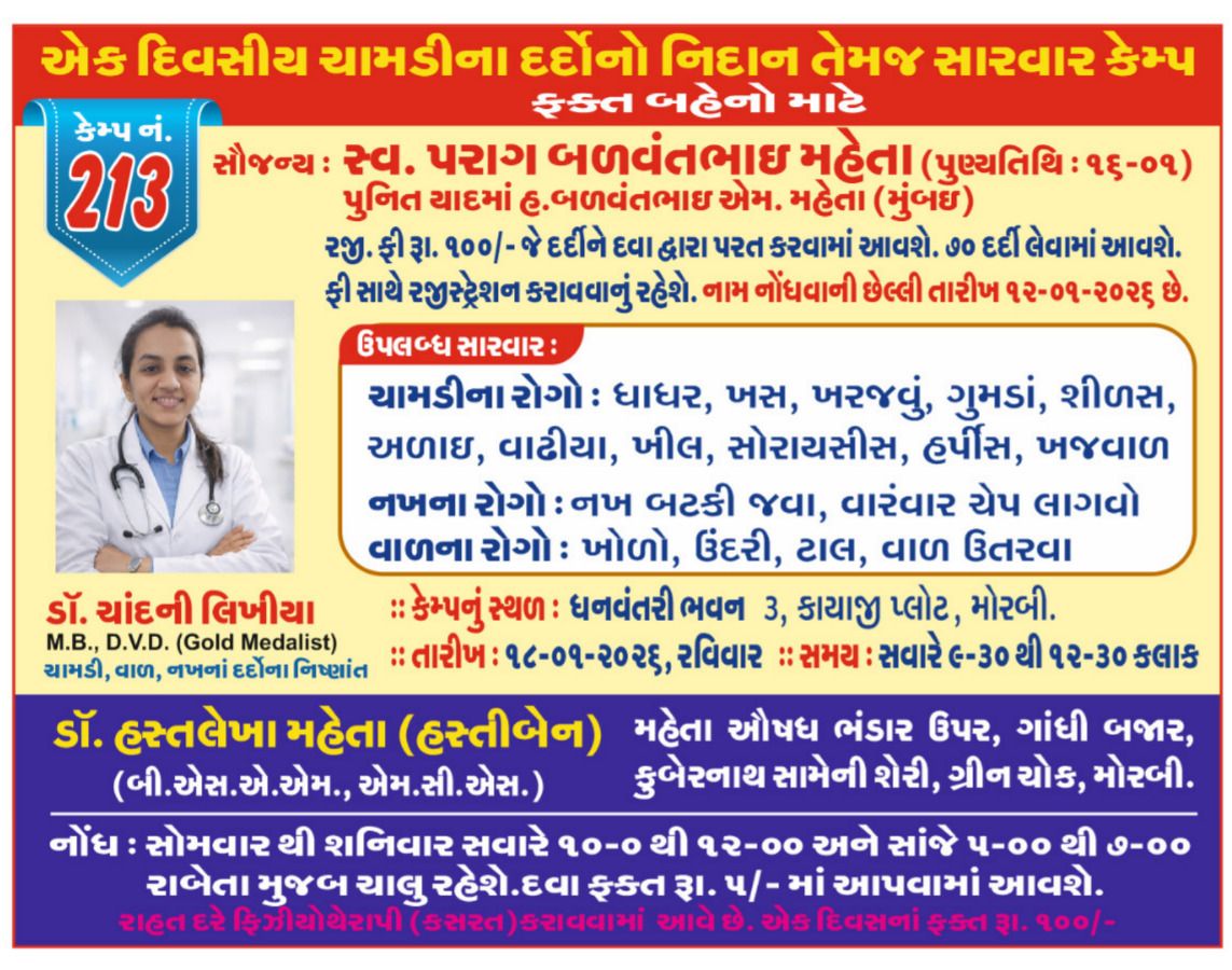 ગોલ્ડ મેડાલિસ્ટ અને ચામડીના દર્દોના નિષ્ણાત ડૉ. ચાંદનીબેન લિખિયા (M.B.D.V.D.) દ્વારા આ કેમ્પમાં નિદાન અને સારવાર આપવામાં આવશે. આ કેમ્પ 18/01/2026 ને, રવિવારના રોજ સવારે 09:30 થી 12:30 સુધી ધન્વંતરી ભવન 3, કાયાજી પ્લોટ, મોરબી ખાતે યોજાશે. જેની રજિસ્ટ્રેશન ફી રૂ. 100 નિર્ધારિત કરી છે, જે દવા દ્વારા પરત મળશે.