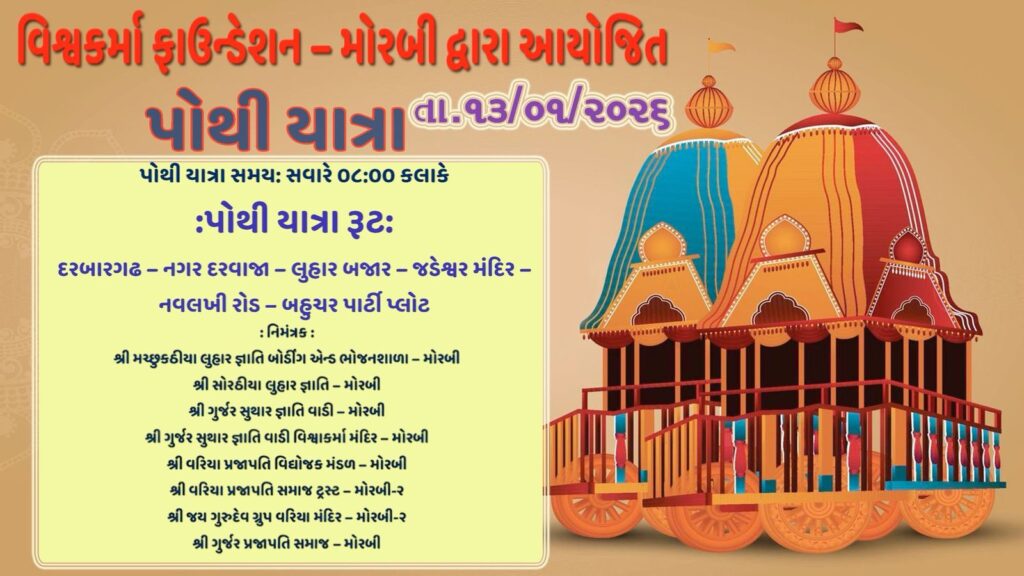 પુરાણ કથાનો શુભારંભ 13/01/2026 (મંગળવાર) ના રોજ સવારે 8:00 વાગે એક ભવ્ય અને દિવ્ય શોભાયાત્રાથી થશે. આ પોથીયાત્રા દરબાર ગઢથી શરૂ થઈને નગર દરવાજા, લુહાર બજાર, જડેશ્વર મંદિર, નવલખી રોડ થઈને બહુચર પાર્ટી પ્લોટ (કથામંડપ) પહોંચશે. આ શોભાયાત્રામાં વિશ્વકર્મા બંધુઓને પોતાના વાહન સાથે જોડાઈને દાદાનું સ્મરણ કરતા કરતાં ધામધૂમથી આ ઉત્સવમાં સહભાગી થવા માટે હાર્દિક નિમંત્રણ પાઠવવામાં આવ્યું છે.