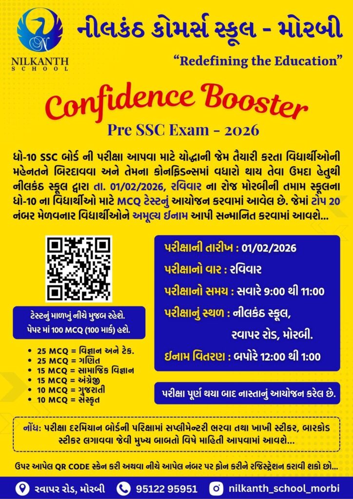 વિદ્યાર્થીઓની મહેનત ને બિરદાવવા અને તેમના આત્મવિશ્વાસ માં વધારો થાય તથા બોર્ડની પરીક્ષાનો ડર(ભય)દૂર થાય તેવા ઉમદા હેતુ થી નીલકંઠ સ્કૂલ દ્વારા તા.01/02/2026, રવિવાર ના રોજ મોરબી ની તમામ સ્કૂલ અને કલાસીસના ધો-10 ના વિદ્યાર્થીઓ માટે MCQ ટેસ્ટ નું આયોજન કરવામાં આવેલ છે. જેમાં ટોપ 20 નંબર મેળવનાર વિદ્યાર્થીઓને અમૂલ્ય ઈનામ આપી સન્માનીત કરવામાં આવશે.