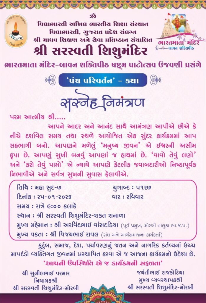 આ કાર્યક્રમ એટલે “પંચ પરિવર્તન કથા” . સમાજમાં આ પાંચ પરિવર્તનથી વ્યક્તિથી લઈને પ્રકૃતિ સુધી એની સારી અસરોથી આવનારી પેઢી લાભાનવિત થશે. આ કથા નો લાભ લેવા માટે મોરબીની તમામ રાષ્ટ્રભક્ત તથા પ્રકૃતિ પ્રેમી પ્રજાને હાર્દિક નિમંત્રણ છે. આ કાર્યક્રમ સરસ્વતી શિશુ મંદિર સનાળા વિદ્યાલય પર થવાનો છે.