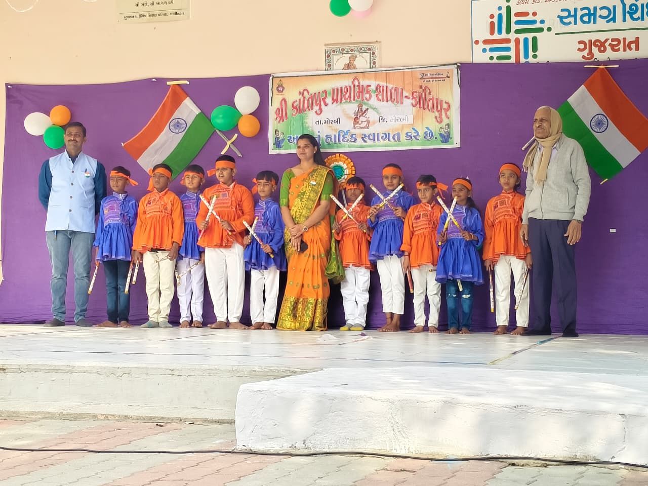 મોરબી તાલુકાના કાંતિપુર પ્રા. શાળામાં 77 માં પ્રજાસતાક દિન નિમિત્તે ધ્વજવંદન કાર્યક્રમ કરવામાં આવ્યો જેમાં ગામમાં સૌથી વધુ ભણેલી દીકરી ઠોરિયા મયુરીબેન દિનેશભાઈના હસ્તે ધ્વજવંદન કરવામાં આવ્યું, ત્યારબાદ સાંસ્કૃતિક કાર્યક્રમ કરવામાં આવ્યો.