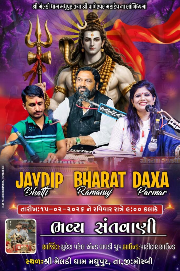 મોરબી: મોરબી જિલ્લાના મેલડીધામ મધુપુર તથા પાળેશ્વર મહાદેવના સાનિધ્યમાં મહાશિવરાત્રીના પર્વ નિમિત્તે આગામી 15 ફેબ્રુઆરી 2026, રવિવારના રોજ રાત્રે 9:00 કલાકે ભવ્ય સંતવાણીનું આયોજન કરવામાં આવ્યું છે. આ ધાર્મિક કાર્યક્રમમાં લોકપ્રિય કલાકારો જયદીપ ભટ્ટી, ભરત રામાનુજ અને દક્ષા પરમાર પોતાની અનોખી શૈલીમાં ભજનોની રમઝટ બોલાવશે. આ કાર્યક્રમમાં સંગીત સાથમાં સુરેશ પટેલ એન્ડ વાવડી ગ્રુપ તેમજ પાટીદાર સાઉન્ડ જોડાશે. શિવભક્તિ અને લોકસાહિત્યના આ સંગમમાં પધારવા મેલડીધામ મધુપુર દ્વારા ભાવિકોને હાર્દિક આમંત્રણ પાઠવવામાં આવ્યું છે.